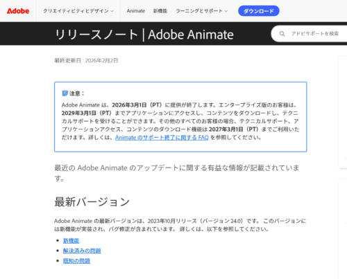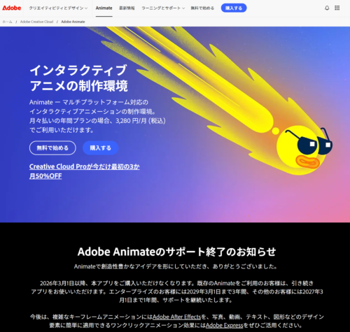 Adobe『Animate』提供が2026年3月1日終了 Flashから続いた30年の歴史に幕。代替ソフトや対応方法は? Adobe『Animate』提供が2026年3月1日終了 Flashから続いた30年の歴史に幕。代替ソフトや対応方法は? UZUREA News 公開:2026年2月4日(2時間前) コメント 0件 ソフトウェアAdobeweb制作サービス終了サブスクリプションソフトウェアツールデザイン Post X Share Facebook B! はてブ LINE 当記事の内容および記事中のリンクには、広告目的や当サイトが収益を得るためのものが含まれており、これらの収益によってuzurea.netは運営されています。 Adobeは、CreativeCloudラインナップに含まれる2Dアニメーション制作ソフト『Adobe Animate』の提供およびサポートを順次終了することを発表しました。 かつてインターネットの表現を劇的に変えた『Macromedia Flash』の後継ソフトとして、多くのWebアニメーターやゲーム開発者に愛用されてきたツールが、ついにその歴史を終えようとしています。 本記事では、公式が発表した終了スケジュールと、既存ユーザーが今すぐ行うべき対策、そして移行先となる代替ソフトについて詳しく解説します。 記事の索引1 『Adobe Animate』2026年3月に提供終了 そのスケジュールと、公式リリース1.1 サポート終了までのスケジュール1.2 サポート終了日には.fla .xflファイルへのアクセスも終了1.3 Animate/Flashの登場とこれまでの歴史2 難民化するクリエイター。現実的な代替候補は?2.1 1. 2Dアニメ制作2.2 2. イラスト制作2.3 3. ゲーム・インタラクティブ開発2.4 旧パッケージ版を入手しておくのも一手ですが……3 存続を求める署名活動も4 まとめ、関連リンク 『Adobe Animate』2026年3月に提供終了 そのスケジュールと、公式リリース 2026年2月2日、Adobeの公式FAQや、Animateの掲載ページにて『Adobe Animate』提供に関する告知が掲載されました。 Adobe Animateのサポート終了のお知らせAdobe.com Animateページスクリーンショット Adobe Animateのサポート終了のお知らせAnimateで創造性豊かなアイデアを形にしていただき、ありがとうございました。 2026年3月1日以降、本アプリをご購入いただけなくなります。既存のAnimateをご利用のお客様は、引き続きアプリをお使いいただけます。エンタープライズのお客様には2029年3月1日まで3年間、その他のお客様には2027年3月1日まで1年間、サポートを継続いたします。 今後は、複雑なキーフレームアニメーションにはAdobe After Effectsを、写真、動画、テキスト、図形などのデザイン要素に簡単に適用できるワンクリックアニメーション効果にはAdobe Expressをぜひご活用ください。 Adobe 日本語公式サイト サポート終了に関する文言 現役利用者としては「ありがとうございました」ではなく……何とかしてくれ、というのが正直なところではないかと。 Adobe Animate最新版の起動画面 これらの文言は、Animate製品ページの他、FAQページや、リリースノートなどからも言及されています。 Animate のサポート終了に関する FAQ 2026年2月2日公式FAQ(日本語): https://helpx.adobe.com/jp/animate/kb/end-of-life.html 同公式FAQ(英語): https://helpx.adobe.com/animate/kb/end-of-life.html 製品ページ(日本語): https://www.adobe.com/jp/products/animate.html 製品ページ(英語): https://www.adobe.com/products/animate.html リリースノート: https://helpx.adobe.com/jp/animate/release-notes.html Adobe Animat リリースノート 2026年2月3日時点掲載内容 サポート終了までのスケジュール プロセスは2026年3月より開始されます。 概要終了予定日(米国太平洋時間※)内容新規販売・提供終了2026年3月1日新規購入ができなくなり、Adobe.comからの入手が停止。一般サポート終了2027年3月1日非エンタープライズ顧客の技術サポート、アプリへのアクセス、コンテンツダウンロードが終了。法人サポート終了2029年3月1日エンタープライズ版顧客向けの全サポートが終了。 ※日本語FAQでは(PT=米国太平洋時間)と明記されており、日本時間では3月2日に食い込む可能性もあります サポート終了日には.fla .xflファイルへのアクセスも終了 アドビは、サポート終了日2027年3月1日をもって「Animateファイル(FLA/XFL)およびプロジェクトデータへのアクセスも終了する」と明言しています。 つまりこの日を境に、ローカルに保存したAdobeCreativeCloud経由でAnimateの起動ができなくなる=該当ファイルへのアクセスも完全に不能になるという事です。 実施しておきたい対策として、アクセス不能になる前に、SWF、SVG、MP4などの形式へ書き出しはしておいたほうがよさそうです。 Animate/Flashの登場とこれまでの歴史 1996年5月:FutureWave SoftwareがFutureSplash Animatorを公開 1996年12月:MacromediaがFutureWaveを買収し、製品名を『Macromedia Flash』に変更 2000年代:Flash5にActionScriptが搭載 より高度なアニメーション&プログラムの制作が可能になり、多くのクリエイターが利用しはじめる。 2ちゃんねる等の掲示板を中心に『Flashアニメ』が爆発的に流行し、個人クリエイターが低容量で滑らかなアニメを作れる唯一無二のツールとして利用者が拡大 2004年:ActionScript 2が登場 2005年:AdobeがMacromediaを買収 2006年:ActionScript