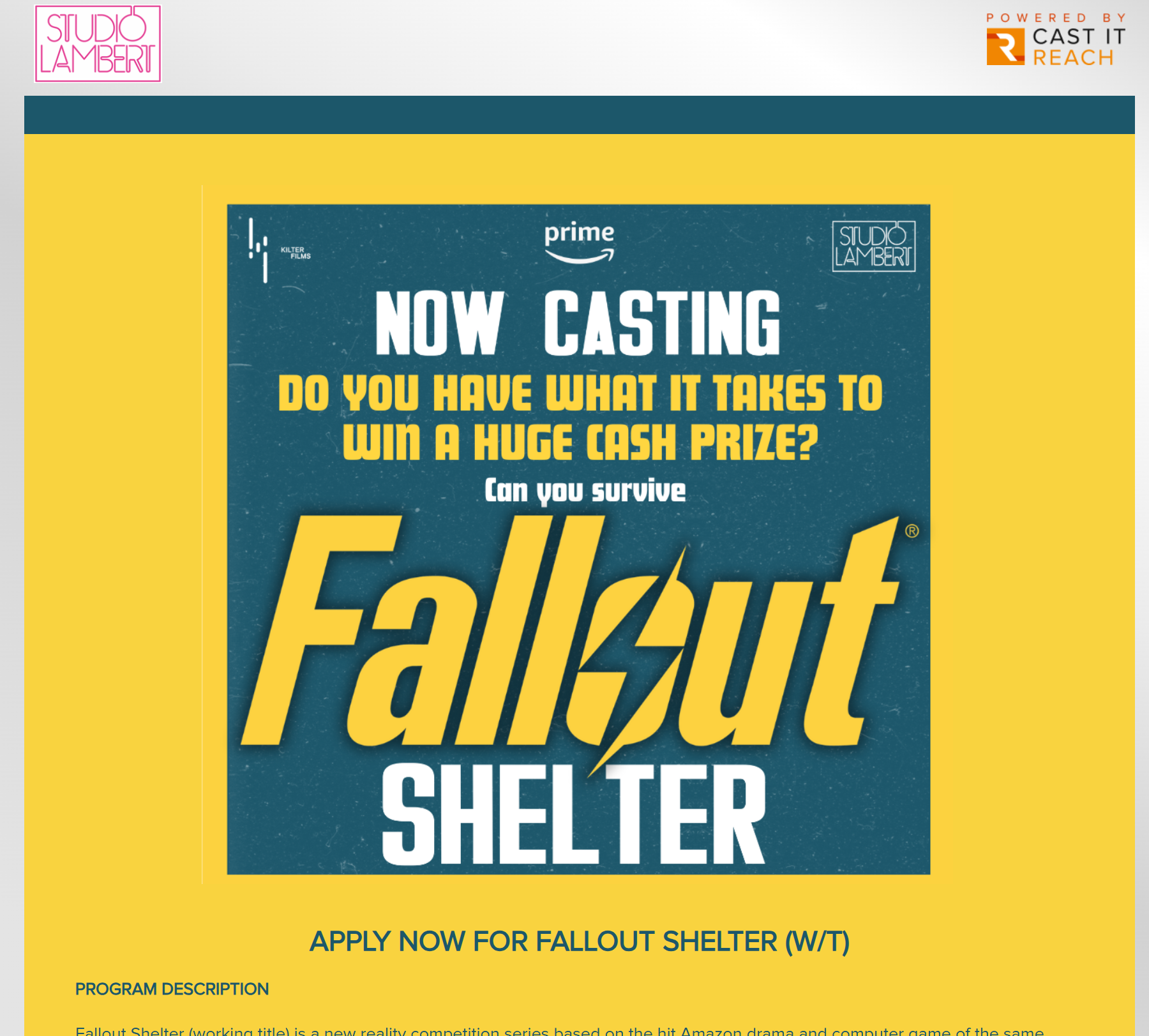 Amazonがリアリティ番組『フォールアウト シェルター』制作を発表 参加者公募ページも公開 Amazonがリアリティ番組『フォールアウト シェルター』制作を発表 参加者公募ページも公開 UZUREA News 公開:2026年1月19日(5時間前) コメント 0件 エンターテインメントゲームAmazonPrime Videoゲームリアリティ番組海外 Post X Share Facebook B! はてブ LINE 当記事の内容および記事中のリンクには、広告目的や当サイトが収益を得るためのものが含まれており、これらの収益によってuzurea.netは運営されています。 プライムビデオは、人気ゲームおよびドラマシリーズ『フォールアウト』の世界観にインスパイアされた脚本なしのリアリティ番組『フォールアウト シェルター(Fallout Shelter)』を制作することを発表しました。 本作はAmazonオリジナルシリーズとして、Prime Videoにて独占配信される予定です。 記事の索引1 『フォールアウト』の世界を舞台にした新たなノンスクリプトシリーズが始動1.1 没入型サバイバルと戦略性を融合したゲームフォーマット1.2 豪華制作陣が集結1.3 エグゼクティブプロデューサー1.4 『フォールアウト』フランチャイズの拡張として展開1.5 応募条件・注意事項(当サイト訳)2 関連リンク 『フォールアウト』の世界を舞台にした新たなノンスクリプトシリーズが始動 『フォールアウト シェルター』は、作中の企業Vault-Tec社の核シェルター『Vault』を舞台に、参加者たちが巨額の賞金をかけて数々の過酷なチャレンジに挑む競争リアリティ番組。全10話構成で、世界240以上の国と地域に向けてPrime Videoで独占初公開されると発表されています。 没入型サバイバルと戦略性を融合したゲームフォーマット 本作では、ゲームシリーズ『フォールアウト』の特徴であるブラックユーモア、レトロフューチャーな美学、終末後のサバイバル要素を色濃く反映。参加者たちは、エスカレートしていく課題や戦略的なジレンマ、道徳的選択を迫られる状況の中で、創意工夫、チームワーク、粘り強さを試されます。 画像はドラマシリーズ フォールアウトのものAmazon 公式 Newsより 壮大なスケールのチャレンジに加え、社会性や心理描写、物語性を重視したゲーム展開を踏襲し、25年以上にわたり『フォールアウト』シリーズが大切にしてきた選択と結果という精神を忠実に継承するとされています。 豪華制作陣が集結 制作は、『ザ・トレイターズ(The Traitors)』『イカゲーム: ザ・チャレンジ(Squid Game: The Challenge)』『アンダーカバー・ボス(Undercover Boss)』などのリアリティ番組を手がけたStudio Lambertが担当。ドラマシリーズ『フォールアウト』を制作するKilter Filmsと共同制作し、Amazon MGM StudiosおよびBethesda Game Studiosと提携して進められます。 エグゼクティブプロデューサー スティーヴン・ランバート ティム・ハーコート ジャック・バージェス トニ・アイアランド スティーヴン・イェモー スティーヴン・ラヴロック アミナ・バドレシング アビ・ランブリノス ジョナサン・ノーラン(Kilter Films) リサ・ジョイ(Kilter Films) アシーナ・ウィッカム(Kilter Films) ジェームズ・アルトマン(Bethesda Game Studios) トッド・ハワード(Bethesda Game Studios) 『フォールアウト』フランチャイズの拡張として展開 本作は、現在配信中のドラマシリーズ『フォールアウト』や、ゲーム『Fallout 76』、『Fallout 4: Anniversary Edition』、モバイルゲーム『Fallout Shelter』などに続く、新たなエンターテインメント展開の一環となると発表されています。 本発表にあわせて公開された動画では、ゲームプレイヤーにはおなじみのPip-BoyのUIとヴォルトボーイ(Vault Boy)のアニメーションで構成。さらに番組への参加者を募集する公式キャスティングページもオープンしました。 Fallout Shelter – Announcement | Prime Video Fallout Shelter – Announcement | Prime Video 制作会社Studio Lambert名義で公開された、キャスト募集ページスクリーンショット 『フォールアウト シェルター』参加者募集概要(当サイト訳) 『フォールアウト シェルター(仮題)』は、Amazonドラマおよびゲームシリーズ『フォールアウト』を原作としたリアリティ競争番組です。参加者(番組内では「ドウェラー」と呼称)は極秘のVault(核シェルター)で共同生活を送りながら、Falloutシリーズを象徴する7つの能力値『S.P.E.C.I.A.L.』──筋力、知覚、耐久、カリスマ性、知性、敏捷性、運──を試される一連のゲームに挑みます。 『S.P.E.C.I.A.L.』とは? 『フォールアウト シェルター』では、シリーズを象徴する7つの能力値S.P.E.C.I.A.L.がゲームの根幹を成すと提示されてまいす。以下はゲーム中での『S.P.E.C.I.A.L.』。 Strength(筋力)—肉体的な強さやパワーを示す能力。力仕事や直接的な対決で重要となる。 Perception(知覚)—周囲の状況や変化を察知する能力。罠や嘘、人間関係の機微を見抜く力。 Endurance(耐久)—身体的・精神的なタフさを表す指標。長期戦や極限状態で真価を発揮する。 Charisma(魅力)—他者に影響を与える力。交渉、同盟形成、人気や信頼の獲得に直結する。 Inte