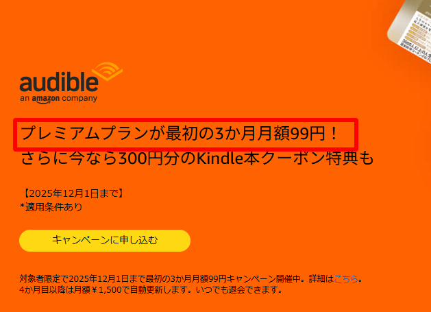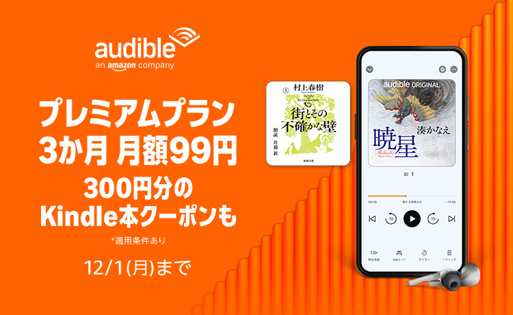 【ブラックフライデー2025】 audible(オーディブル) 『3か月 月額99円+300円Kindleクーポン』キャンペーン 12月1日まで 【ブラックフライデー2025】 audible(オーディブル) 『3か月 月額99円+300円Kindleクーポン』キャンペーン 12月1日まで UZUREA News 公開:2025年11月17日(3時間前) / 更新:2025年11月18日 コメント 0件 セール・クーポン2025年ブラックフライデーAmazonaudibleオーディオブックキャンペーンサービスサブスクリプション Post X Share Facebook B! はてブ LINE 当記事の内容および記事中のリンクには、広告目的や当サイトが収益を得るためのものが含まれており、これらの収益によってuzurea.netは運営されています。 Amazonの『聴く読書』=オーディオブックサービス『Audible(オーディブル)』プレミアムプランが3か月 月額99円で利用できるキャンペーンが開催中です。 2025年11月14日~12月1日の期間中、キャンペーン用ページから聴き放題会員に登録すると、通常月額1,500円が3か月間月額99円となります。 記事の索引1 Audible(オーディブル) 3か月 月額99円キャンペーン 12/1まで1.1 Audibleの最新おすすめ作品1.2 Audible会員なら定額聴き放題1.3 Audible会員プラン キャンペーンの利用手順1.4 Audibleは定期的キャンペーンを開催していますが……1.5 Audible とは1.6 最適な解約タイミングは?1.7 Audibleについてもう少し詳しく知りたい方は……2 2025 Amazonブラックフライデー について3 関連リンク Audible(オーディブル) 3か月 月額99円キャンペーン 12/1まで 世界最大級のオーディオブック・音声コンテンツ配信サービス『Amazon Audible(オーディブル)』は、2025年11月14日~12月1日の期間限定で、お得なキャンペーンを実施しています。 Audible(オーディブル) 3か月 月額99円キャンペーン 12/1まで キャンペーンページから『Audible プレミアムプラン』に申し込むと、登録日から3か月間、通常月額1,500円のプランを月額99円で利用することが可能。数十万点以上のオーディオブックやポッドキャスト、Audibleオリジナル作品まで、幅広いコンテンツを好きなだけ楽しむことができます。 また、今回のキャンペーンでは更にKindle本購入時に使える300円分のクーポンもプレゼントされます。無料体験終了後は自動的に月額1,500円で更新されますが、いつでも退会が可能。気軽に試せるチャンスとなっています。 Audible3か月 月額99円キャンペーンamazon 登録ページ なお、このキャンペーンは『初めてAudibleの無料体験』を利用する人だけではなく、前回無料体験をしてから一定期間(1年以上?)経ったユーザーも対象となっているようです。自分が対象者かどうかは、キャンペーンページを開いたときのキャンペーンバナーが表示されるかどうかで確認できます。 キャンペーンバナー Audibleの最新おすすめ作品 国宝 上 青春篇 著者:吉田 修一 ナレーター:尾上 菊之助 再生時間: 21 時間 7 分 Audible価格 3,500円(聴き放題プラン参加中なら無料) 詳細をチェック 8番出口 著者: 川村 元気 ナレーター: 梶 裕貴 再生時間: 3 時間 10 分 Audible価格 2,500円(聴き放題プラン参加中なら無料) 詳細をチェック 遠い山なみの光 著者:カズオ イシグロ, 小野寺 健(翻訳) ナレーター:野崎 千華 再生時間: 8 時間 51 分 Audible価格 3,000円(聴き放題プラン参加中なら無料) 詳細をチェック NEXUS 情報の人類史 上: 人間のネットワーク 著者: ユヴァル・ノア・ハラリ (著), 柴田 裕之 (翻訳) ナレーター: 山口 令悟 再生時間: 11 時間 14 分 Audible価格 3,500円(聴き放題プラン参加中なら無料) 詳細をチェック ブレイクショットの軌跡 著者:逢坂 冬馬 ナレーター:藤井 剛 再生時間: 22 時間 25 分 Audible価格 5,000円(聴き放題プラン参加中なら無料) 詳細をチェック アルジャーノンに花束を 〔新版〕 著者: ダニエル・キイス, 小尾 芙佐 ナレーター: 池澤 春菜 再生時間: 14 時間 12 分 Audible価格 4,000円(聴き放題プラン参加中なら無料) 詳細をチェック Audible会員なら定額聴き放題 会員は12万以上の対象作品が聴き放題となるほか、下記の特徴があります。 オフライン再生可能 再生スピード調整可能(0.5~3.5倍) プロの声優や俳優の朗読も楽しめる Audibleでしか聴けない本やポッドキャストも多数 ※聴き放題対象外の本については、会員なら非会員価格の30%引きで購入可能です。 Audible会員プラン キャンペーンの利用手順 Audible会員登録からスマートフォンで利用開始するまでの流れは下記の通りです。 Audibleはアプリでも楽しめる キャンペーンページからAudible会員に登録 アプリをダウンロード 聴きたい本を選んで再生 Audible iOS版アプリ Audible Android版アプリ Audibleは定期的キャンペーンを開催していますが…… Audibleのキャンペーンは定期的に開催されていますが、それぞれ少し特典が異なります。過去の開催と比べても、今回はお得な内容となっていますのでこのチャンスにお試しをするのも良いのではないでしょうか。 2022年4月11日~5月11日:新規登録者 2か月無料 2022年6月17日~7月25日:プライム会員の新規登録者 3か月無料 2022年8月31日~10月12日:新規登録者 2か月無料 2022年11月18日~12月26