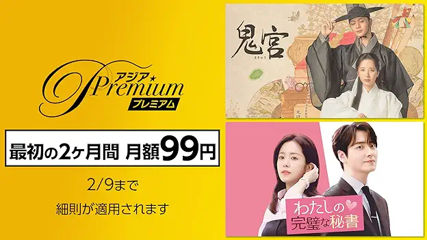 Amazonプライムビデオ『アジアPremium』追加サブスクチャンネル 最初の2か月99円/月キャンペーン 2月9日まで Amazonプライムビデオ『アジアPremium』追加サブスクチャンネル 最初の2か月99円/月キャンペーン 2月9日まで UZUREA News 公開:2026年2月1日(3時間前) コメント 0件 エンターテインメントセール・クーポンAmazonPrime VideoVODキャンペーンサブスクリプションセール情報 Post X Share Facebook B! はてブ LINE 当記事の内容および記事中のリンクには、広告目的や当サイトが収益を得るためのものが含まれており、これらの収益によってuzurea.netは運営されています。 Amazonプライムビデオの追加チャンネル『アジアPremium』にて、新規登録者を対象に最初の2ヶ月間、月額550→99円(税込)となるキャンペーンが開催中です。 2026年2月9日までの期間限定キャンペーンで、2ヶ月の期間終了後は通常料金に戻りますが、期間内での解約も可能です。本記事では、キャンペーンの概要に加え、解約し忘れを防ぐための具体的な設定方法についても詳しく解説します。 記事の索引1 Amazonプライム・ビデオ サブスク『アジアPremium』最初の2か月 月額550円→99円1.1 アジアPremium とは2 アマプラ有料サブスクを無料期間後に解約し忘れるのを防ぐ簡単な方法3 関連リンク Amazonプライム・ビデオ サブスク『アジアPremium』最初の2か月 月額550円→99円 Amazonは、プライムビデオの有料サブスクリプション『アジアPremium』が最初の2か月間、月額99円で利用できるキャンペーンを実施中です。 Amazonプライム・ビデオ サブスク『アジアPremium』最初の2か月 月額550円→99円 本キャンペーンは、2026年2月9日までの期間限定で、『アジアPremium』の新規登録者を対象にしたお得な内容です。通常月額550円(税込)のところ、最初の2か月は月額わずか99円(税込)で利用可能。2か月後は通常料金に戻り、キャンセルしない限り自動更新されます。 アジアPremium作品一覧 アジアPremium新規入会 申し込み Amazonプライムビデオトップページ Amazonプライム 月額600円30日無料体験はこちら 学生なら学割で 月額300円プライム・スチューデント がお得 アジアPremium とは Amazon Prime Videoの追加チャンネル『アジアPremium』は、韓国や中国を中心としたアジア圏のエンターテインメントに特化した定額制サービス。通常月額は550円(税込)で、14日間の無料体験期間が設けられています。 アジアPremiumスクリーンショット 『アジアPremium』で視聴できる主なラインナップは以下の通りです。特に韓国ドラマの復讐劇や医療ドラマ、時代劇の層が厚いのが特徴です。 1. 韓国ドラマ(ヒット作・話題作) 中毒性の高い“マクチャンドラマ”や、本国で高視聴率を記録した人気作が揃っています。 『ペントハウス』シリーズ: 社会現象を巻き起こした衝撃の復讐サスペンス。 『浪漫ドクター キム・サブ』: 圧倒的な支持を得ている本格医療ドラマ。 『復讐代行人~模範タクシー~』: 痛快な復讐アクションが話題のヒット作。 『皇后の品格』: 架空の皇室を舞台にした愛憎劇。 2. 時代劇・独占配信 他サービスでは見られない独占タイトルや、重厚な歴史ドラマも魅力です。 『元敬(ウォンギョン)〜欲望の王妃〜』: 見放題独占配信の最新時代劇。 『薯童謠(ソドンヨ)』: 『宮廷女官チャングムの誓い』の監督が手掛けた名作。 『大風水』: 高麗末期から朝鮮建国を描いた壮大な歴史絵巻。 3. 中国ドラマ・バラエティ 韓国ドラマ以外にも、エンタメ番組や華流ファン向けのドラマも充実しています。 バラエティ・音楽: 人気のK-POP音楽番組や、韓国の人気バラエティ『ランニングマン』などが視聴可能です。 中国ドラマ: 現代のロマンスからファンタジー時代劇まで。 アマプラ有料サブスクを無料期間後に解約し忘れるのを防ぐ簡単な方法 Amazonプライムビデオの追加有料サブスクは、割引期間後にそれぞれ月額の金額が発生します……が、簡単な方法で割引(無料)期間の日数だけ楽しんで、自動有料更新を停止しておくことができます。 以下にその方法を掲載しておきますので、まずはこの方法を使って『うっかり支払い続けてしまった』というのを防ぎましょう。もちろんサブスクが気に入ったら、その後であらためて利用更新を再開する事もできますよ。 ※キャンペーン期間が1か月を超えている場合、期間が最後の1か月に入ってから対応してください。システム上、キャンペーン期間が残っていても1か月区切りで解約となってしまう場合があります。 Amazonアカウントの [アカウントと設定] > [サブスクリプション設定] にアクセス サブスクの一覧から該当の『サブスクリプションを登録解除』をクリック/タップ 『○○(該当サブスク名)登録を終了しますか?』という画面に推移するので『自動更新機能を無効にして、20xx年○月○日まで視聴する。』を選択 (登録解除についてのアンケートが表示されますが、どれを選択してもOK) 以上で完了です。 この手続きをしておけば、割引期間が利用できる日まで有料サブスクの動画を見続ける事が出来