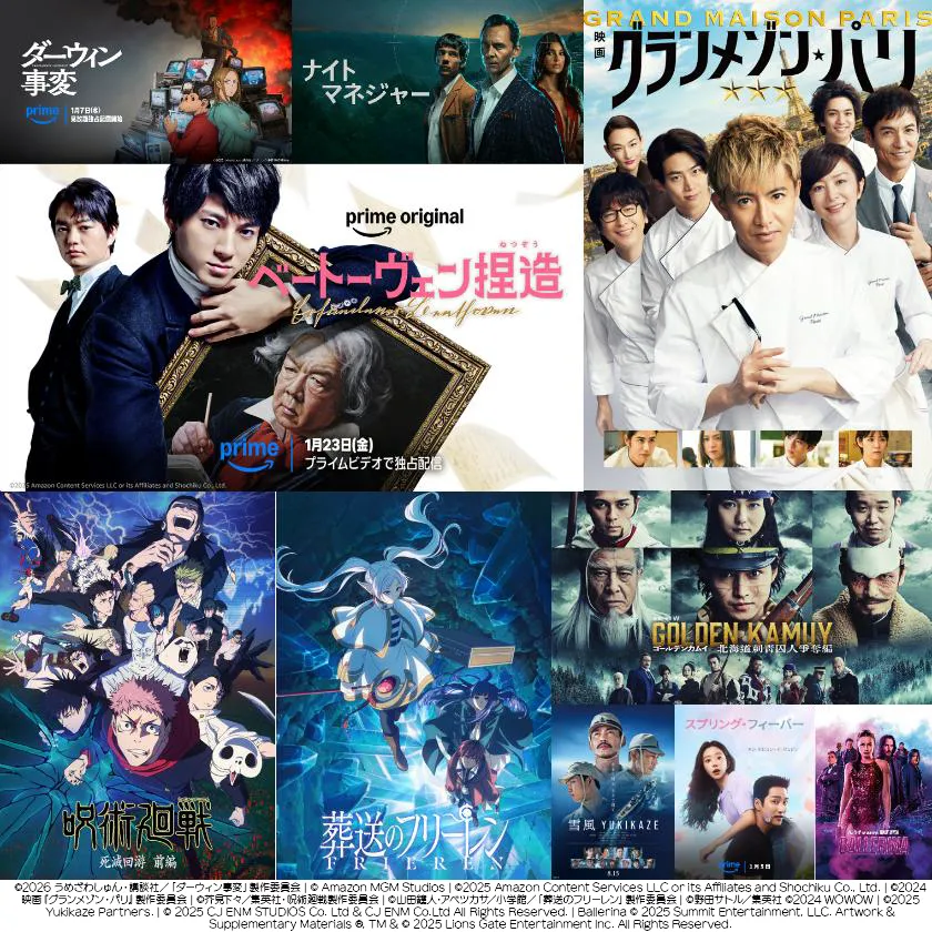 Amazonプライムビデオ 2026年1月配信の見放題作品一覧 冬アニメは57作品以上が配信 映画・ドラマも続々 UZUREA編集部 公開:2025年12月25日(3時間前) コメント 0件 エンターテインメント漫画・アニメAmazonAmazonPrimeVideo新作配信情報VODアニメドラマ映画 Post X Share Facebook B! はてブ LINE 当記事の内容および記事中のリンクには、広告目的や当サイトが収益を得るためのものが含まれており、これらの収益によってuzurea.netは運営されています。 2026年新年1月に配信されるAmazonプライムビデオの見放題配信作品を観やすい一覧でご紹介! 記事の前半はカテゴリ別の一覧形式で、後半では注目作品をピックアップしてご紹介しています。 記事の索引1 Prime Video 2025年12月の見放題配信作品一覧1.1 映画(日本)1.2 映画(海外)1.3 映画(韓国・中国・アジア)1.4 アニメ映画1.5 ドラマシリーズ(日本)1.6 ドラマシリーズ(海外)1.7 ドラマシリーズ(韓国・中国・アジア)1.8 アニメシリーズ2 2025年12月配信の注目作品ピックアップ2.1 アニメ『かぐや様は告らせたい 大人への階段』 1月1日配信2.2 アニメ『ゴールデンカムイ 最終章』 1月5日配信スタート2.3 アニメ『ダーウィン事変』 1月7日配信スタート2.4 映画『JUNK WORLD』3 関連リンク Prime Video 2025年12月の見放題配信作品一覧 Amazonプライムビデオは多数の作品が常時配信されていきます。それに合わせて当ページのリストも更新していきますので、ブックマークしてご活用ください。 映画(日本) JUNK WORLD 1月1日(木・祝) 見放題独占 聖☆おにいさん THE MOVIE ホーリーメンVS悪魔軍団 1月2日(金) 見放題最速 蟹工船(2009年版) 1月3日(土) KIDS 1月3日(土) ゴールデンカムイ 1月5日(月) 雪風 YUKIKAZE 1月9日(金) 独占 Gメン 1月10日(土) Prime Original ベートーヴェン捏造 1月23日(金) 独占 劇場版 君と世界が終わる日に FINAL 1月26日(月) 52ヘルツのクジラたち 1月28日(水) 言えない秘密 1月28日(水) 映画 グランメゾン・パリ 1月30日(金) 見放題独占 映画(海外) I am Sam アイ・アム・サム 1月1日(木・祝) コヴェナント/約束の救出 1月1日(木・祝) シューテム・アップ 1月1日(木・祝) パレードへようこそ 1月1日(木・祝) ブルドッグ 1月1日(木・祝) Prime Original ティーガー 1月2日(金)8:00~ Amazonオリジナル アースクエイク2025 1月8日(木) カッコウ 1月9日(金) 見放題最速 バレリーナ:The World of John Wick 1月16日(金) 独占 Prime Original チーカティロ:闇の中で 1月23日(金)3:30~ Amazonオリジナル Prime Original レッキング・クルー 1月28日(水)17:00~ Amazonオリジナル 映画(韓国・中国・アジア) 呪葬 1月1日(木・祝) フンパヨン 呪物に隠れた闇 1月15日(木) アニメ映画 ルパン三世 くたばれ!ノストラダムス 1月1日(木・祝) ルパン三世 DEAD OR ALIVE 1月1日(木・祝) ドラマシリーズ(日本) 14才の母 ~愛するために 生まれてきた~ 1月1日(木・祝) 3年C組は不倫してます。 1月1日(木・祝) 恋です! ~ヤンキー君と白杖ガール~ 1月1日(木・祝) モンスター 1月1日(木・祝) 連続ドラマW ゴールデンカムイ ―北海道刺青囚人争奪編― 1月5日(月) 略奪奪婚 1月7日(水) 元科捜研の主婦 1月16日(金) ガラスの指輪と絆創膏 1月17日(土) 50分間の恋人 1月18日(日) 見放題最速 ドラマシリーズ(海外) フォールアウト シーズン212月17日(水)より毎週配信中 Amazonオリジナル ナイト・マネジャー シーズン2 1月11日(日)17:00~ Amazonオリジナル ドラマシリーズ(韓国・中国・アジア) 王は愛する 1月1日(木・祝) 7人の脱出 1月1日(木・祝) ホジュン〜伝説の心医〜 1月1日(木・祝) モダン・ファーマー 1月1日(木・祝) 浮図縁~乱世に咲く真実の愛~ 1月4日(日) スプリング・フィーバー 1月5日(月) 独占(毎週月・火) 鳳囚凰 〜陰謀と裏切りの後宮〜 1月7日(水) 世子<セジャ>が消えた~禁じられた愛~ 1月11日(日) 胡桃恋慕~禁じられた両家の恋~ 1月14日(水) 荘主の花嫁はシンデレラ~江湖を守る二人の愛~ 1月14日(水) 千万回の愛~二人の愛は輪廻を巡る~ 1月21日(水) 冬夜雲歌~偽りのプリンセスと冷酷王子~ 1月28日(水) アニメシリーズ 2026年冬の新作アニメ この冬はじまる新作アニメシリーズ! 配信日から、毎週随時最新話が配信されます #神奈川に住んでるエルフ 12月09日(火) 見放題 作品の詳細アンデッドアンラック Winter編 12月26日(金) 01:10 見放題レンタル 作品の詳細かぐや様は告らせたい 大人への階段 1月01日(木) 00:00 見放題 作品の詳細MFゴースト 3rd Season 1月01日(木) 23:30 見放題 作品の詳細最推しの義兄を愛でるため、長生きします! 1月03日(土) 22:00 見放題 作品の詳細勇者刑に処す 懲罰勇者9004隊刑務記録 1月03日(土) 22:00 見放題 作品の詳細多聞くん今どっち!? 1月04日(日) 01:00 見放題 作品の詳細花ざかりの君たちへ 1月04日(日) 22:00 見放題 作品の詳細勇者パーティを追い出された器用貧乏 1月04日(日) 23:00 見放題レンタル 作品の詳細違国日記 1月05日(月) 01:00 見放題レンタル 作品の詳細北斗の拳 拳王軍ザコたちの挽歌 1月05日(月) 20:30 見放題 作品の詳細ヴィジランテ -僕のヒーローアカデミア ILLEGALS- 第2期 1月05日(月) 22:30 見放題レンタル 作品の詳細ゴールデンカムイ 最終章 1月05日(月) 23:00 見放題 
