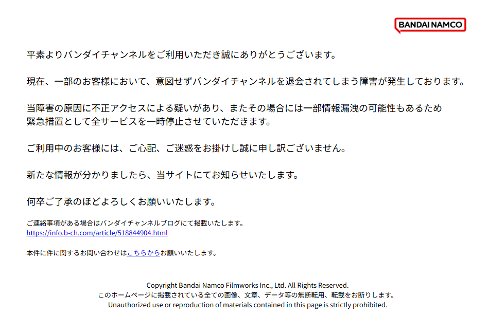 動画配信サービス『バンダイチャンネル』がサービスを緊急一時停止中 『不正アクセス』の可能性があるためと発表 動画配信サービス『バンダイチャンネル』がサービスを緊急一時停止中 『不正アクセス』の可能性があるためと発表 UZUREA News 公開:2025年11月7日(8時間前) コメント 0件 エンターテインメントVODアニメサービス動画映画バンダイナムコフィルムワークス Post X Share Facebook B! はてブ LINE 当記事の内容および記事中のリンクには、広告目的や当サイトが収益を得るためのものが含まれており、これらの収益によってuzurea.netは運営されています。 動画配信サービス『バンダイチャンネル』が、2025年11月6日深夜よりサービスを全サービスを一時停止しています。理由として『不正アクセスによる疑いがあり(原文まま)』と発表しています。 記事の索引1 動画配信サービス『バンダイチャンネル』がサービスを緊急一時停止(11月6日22時31分発表)1.1 意図せず退会してしまう障害は11月4日に発表2 関連リンク 動画配信サービス『バンダイチャンネル』がサービスを緊急一時停止(11月6日22時31分発表) 日本国内の動画配信サービス『バンダイチャンネル』がサービスを緊急一時停止しています。 バンダイチャンネル 公式サイト https://www.b-ch.com/ スクリーンショット この理由については『バンダイチャンネルからのお知らせ』Seesaa Blog において下記のように掲載されています。 平素よりバンダイチャンネルをご利用いただき誠にありがとうございます。現在、一部のお客様において、意図せずバンダイチャンネルを退会されてしまう障害が発生しております。 当障害の原因に不正アクセスによる疑いがあり、またその場合には一部情報漏洩の可能性もあるため緊急措置として全サービスを一時停止させていただきます。 ご利用中のお客様には、ご心配、ご迷惑をお掛けし誠に申し訳ございません。新たな情報が分かりましたら、当サイトにてお知らせいたします。 何卒ご了承のほどよろしくお願いいたします。 バンダイチャンネルのサービス一時停止のお知らせ Seesaa Blog 意図せず退会してしまう障害は11月4日に発表 前述の『意図せずバンダイチャンネルを退会してしまう』という障害については、お案軸Seesaa Blogにて11月4日22時31分に掲載された記事で下記のように好評されています。 現在、一部のお客様において、意図せずバンダイチャンネルを退会されてしまう障害が発生しており、原因の調査を行っております。 ご利用中のお客様には、ご迷惑をお掛けしまして誠に申し訳ございません。本障害により、現在バンダイチャンネルの退会のメニューを一時的に停止しております。※見放題プランの解約は正常に実施いただくことが可能です。 現在、不具合解消のための修復作業を実施しております。お客様にはご迷惑をお掛けしますが、修復作業完了まで今しばらくお待ちいただけますようお願いいたします。 【障害】意図せずバンダイチャンネルを退会されてしまう事象に関しまして Seesaa Blog 不正アクセスの「疑い」との発表ですが……原因は何にせよ、なかなか大規模な障害ですね。貴重な国内動作配信サービスなので、頑張ってほしいところです。 関連リンク バンダイチャンネル 公式トップページ バンダイチャンネル 公式Xアカウント 運営会社バンダイナムコ フィルムワークス 公式 大ヒット連発のバンダイナムコが大切にしているたった1つの考え方 ¥1,199 (2025/11/7 16:29:05時点 Amazon調べ-詳細) Amazonでのレビューを見る Kindle Amazonで検索 楽天市場で検索 Yahoo!ショッピングで検索 メルカリで検索 ghost(仮題) 作品情報 アニメ映画 公開日: –原作者: 夏目真悟, 鈴木智尋, バンダイナムコフィルムワークス監督: 夏目真悟プロデューサー: –脚本: 夏目真悟制作会社: マッドハウス作品概要: 監督、脚本を夏目真悟氏が務める初のオリジナル劇場長編アニメーション。キャラクター原案は漫画家のオノ・ナツメ氏、キャラクターデザインは久貝典史氏が務め、マッドハウスがアニメーション制作を担当。 本作において「虚構とも言えるアニメーションで、今の時代性を汲んだ、リアリティを追求した作品を目指したい」と夏目監督は語っています。 誰しもの心の中にいる“ゴースト”。それは、言葉にならない、でもちゃんとここにある本物の気持ちのこと。 本作は、 “星空”を守るために世界の不条理に反抗する少女 ニケの孤独と勇敢さ、他者との関わりによる心の機微を叙情的に描き出す、挑戦的な作品。2027年の劇場公開に向け、本作に共鳴したクリエイターたちと共に鋭意制作中。 この作品の関連画像・動画・詳細情報をチェック ©ghost production committee