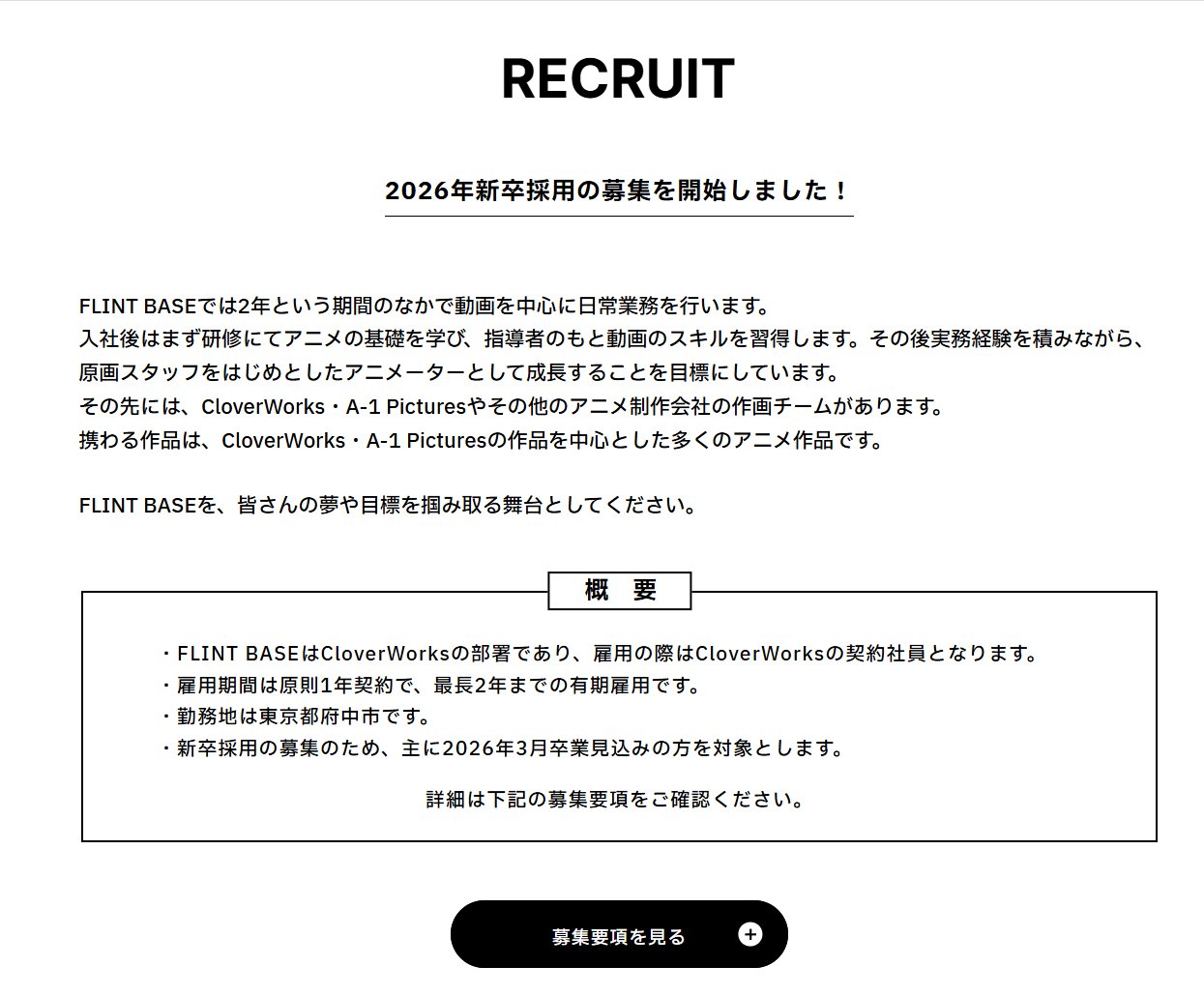 アニメ作画スタジオ『FLINT BASE』 2026年4月始動 学生新卒採用で人材育成を目指すCloverWorksとA-1 Picturesが共同で発表 アニメ作画スタジオ『FLINT BASE』 2026年4月始動 学生新卒採用で人材育成を目指すCloverWorksとA-1 Picturesが共同で発表 UZUREA News 公開:2025年11月4日(8時間前) コメント 0件 漫画・アニメアニメアニメーター企業情報A-1 PicturesCloverWorksFLINT BASE Post X Share Facebook B! はてブ LINE 当記事の内容および記事中のリンクには、広告目的や当サイトが収益を得るためのものが含まれており、これらの収益によってuzurea.netは運営されています。 アニプレックス子会社のアニメ制作スタジオCloverWorksとA-1 Picturesが、アニメーター志望の学生の入口となる育成・実務の場として新作画スタジオ『FLINT BASE(フリントベース)』を2026年4月より開所することを発表しました。 記事の索引1 2026年4月、作画スタジオ『FLINT BASE』開所 CloverWorks・A-1 Picturesによるアニメーター育成拠点1.1 2026年度 新卒採用情報(作画)も掲載2 関連リンク 2026年4月、作画スタジオ『FLINT BASE』開所 CloverWorks・A-1 Picturesによるアニメーター育成拠点 FLINT BASE Logo 『FLINT BASE』は、CloverWorksおよびA-1 Picturesによる新たなチャレンジとしてソニーグループのバックアップのもとで設立する新拠点。。積極的に新卒採用を行って社員アニメーターの育成に取り組んできたCloverWorksとA-1 Picturesが、『アニメーターを目指す多くの学生の入口となれる場所』として開所すると発表しています。 両社で培ってきた社員アニメーター育成体制を維持しつつ、アニメーターを目指す多くの学生に門戸を広げることを目的に、2026年4月から運用を開始します。 FLINT BASE 公式Webサイト 2026年度 新卒採用情報(作画)も掲載 この発表にあわせて、FLINT BASE公式Webサイトも公開され、そこでは2026年度新卒採用の募集開始が告知されています。 FLINT BASE 公式Webサイト スクリーンショット FLINT BASE 公式Webサイト 関連リンク FLINT BASE 公式サイト CloverWorks 公式サイトニュース『FLINT BASE』開所について A-1 Pictures 公式サイトニュース『FLINT BASE』開所について アニメーターが教える線画デザインの教科書 フィルムアート社 ¥2,860 (2025/11/04 13:51:08時点 Amazon調べ-詳細) Amazonでのレビューを見る Amazonで検索 楽天市場で検索 Yahoo!ショッピングで検索 メルカリで検索 SPY×FAMILY 作品情報 アニメシリーズ 公開日: 2022年4月9日(土)話数: 全25話原作者: 遠藤達哉監督: 古橋一浩プロデューサー: –脚本: –シリーズ構成: 古橋一浩制作会社: WIT STUDIO, CloverWorks作品概要: 人はみな 誰にも見せぬ自分を 持っている――世界各国が水面下で熾烈な情報戦を繰り広げていた時代。東国オスタニアと西国ウェスタリスは、十数年間にわたる冷戦状態にあった。西国の情報局対東課〈WISEワイズ〉所属である凄腕スパイの〈黄昏たそがれ〉は、東西平和を脅かす危険人物、東国の国家統一党総裁ドノバン・デズモンドの動向を探るため、ある極秘任務を課せられる。その名も、オペレーション〈梟ストリクス〉。内容は、“一週間以内に家族を作り、デズモンドの息子が通う名門校の懇親会に潜入せよ”。〈黄昏たそがれ〉は、精神科医ロイド・フォージャーに扮し、家族を作ることに。 だが、彼が出会った娘・アーニャは心を読むことができる超能力者、妻・ヨルは殺し屋だった!3人の利害が一致したことで、お互いの正体を隠しながら共に暮らすこととなる。ハプニング連続の仮初めの家族に、世界の平和は託された――。公式Webサイト: https://spy-family.net/公式SNS: XアカウントInstagramアカウントTikTokアカウント 配信サービス: AmazonプライムビデオdアニメストアDisney+DMM TVFODHuluLeminoNETFLIXU-NEXTWOWOWYouTubeニコニコ動画 この作品の関連画像・動画・詳細情報をチェック ©遠藤達哉/集英社・SPY×FAMILY製作委員会 灰と幻想のグリムガル 作品情報 アニメシリーズ 公開日: 2016年1月11日(月)原作者: 十文字青監督: 中村亮介プロデューサー: –脚本: 中村亮介制作会社: A-1 Pictures作品概要: 生きるって、簡単じゃない。 目が覚めると、 ハルヒロは暗闇の中にいた。ここがどこなのか、なぜここにいるのか、そしてどこから来たのかもわからないまま。周りには自分と同じ境遇らしき数名の男女。彼らとともに暗闇から踏み出した先には見たことのない世界、「グリムガル」が広がっていた・・・・・・。記憶も、お金も、特別な力も何もない僕たちが手に入れた現実。公式Webサイト: http://grimgar.com/公式SNS: XアカウントYouTube チャンネル 配信サービス: AmazonプライムビデオdアニメストアDMM TVFODU-NEXTニコニコ動画Bandai Channel この作品の関連画像・動画・詳細情報をチェック ©2016 十文字青・オーバーラップ/灰と幻想のグリムガル製作委員会