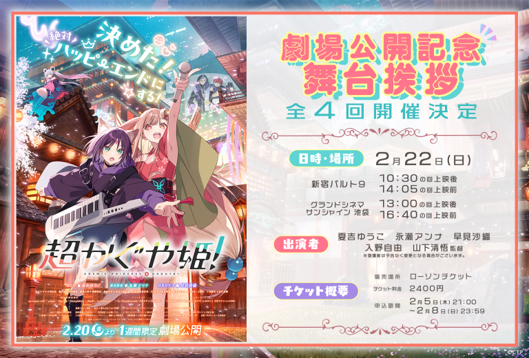 Netflixアニメ映画『超かぐや姫!』 2月20日より1週間限定劇場公開決定! 豪華特典や舞台挨拶も Netflixアニメ映画『超かぐや姫!』 2月20日より1週間限定劇場公開決定! 豪華特典や舞台挨拶も UZUREA News 公開:2026年2月6日(16時間前) コメント 0件 漫画・アニメNETFLIXアニメ作品映画配信 Post X Share Facebook B! はてブ LINE 当記事の内容および記事中のリンクには、広告目的や当サイトが収益を得るためのものが含まれており、これらの収益によってuzurea.netは運営されています。 Netflixで世界独占配信中のオリジナルアニメ映画『超かぐや姫!』が、1週間限定で劇場公開されることが決定しました。公開期間は2026年2月20日(金)から2月26日(木)まで。新宿バルト9、グランドシネマサンシャイン池袋ほか全国18館で上映されます。料金は通常2,200円(税込)、ペア割(2名)3,000円(税込)です。 記事の索引1 『超かぐや姫!』国内外で大反響! 2月20日より1週間限定劇場公開決定1.1 豪華キャスト陣の舞台挨拶は2月22日に4回実施、発声可能上映も1.2 入場者特典は描き下ろしイラスト集1.3 料金と上映劇場について:お得なペア割も1.4 『超かぐや姫!』作品概要2 関連リンク 『超かぐや姫!』国内外で大反響! 2月20日より1週間限定劇場公開決定 配信で大きな反響を呼んでいる『超かぐや姫!』が、2026年2月20日(金)より1週間限定で劇場公開されます。 超かぐや姫! メインビジュアル 本作は2026年1月22日(木)よりNetflixで配信を開始し、翌日には国内のNetflix『今日の映画TOP10』で1位を獲得。グローバルでも非英語映画部門で7位にランクインしました。配信開始直後から大きな注目を集め、SNSでは「ライブシーンを良い音響で観たい」「劇場の大スクリーンで体験したい」といった声が相次いでいました。 本作は、山下清悟監督による初の長編監督作品。制作はスタジオコロリドとスタジオクロマトが担当し、ダイナミックなアクションと豪華ボカロP陣によるライブシーンが見どころです。劇場版では、本編の一部に“劇場でしか観ることのできない演出”も用意されているとのことです。 2月20日(金)より1週間限定で劇場公開決定!劇場公開記念予告、舞台挨拶など新情報一挙公開 – Netflix映画『超かぐや姫!』公式サイト 入場者特典の配布が決定! – Netflix映画『超かぐや姫!』公式サイト 公開劇場一覧 – Netflix映画『超かぐや姫!』公式サイト 『超かぐや姫!』劇場公開記念予告| 2月20日(金) より一週間限定劇場公開 『超かぐや姫!』劇場公開記念予告| 2月20日(金) より一週間限定劇場公開 Netflix映画『超かぐや姫!』公式サイト 配信で話題になっていたものの未視聴だった人も、もう一度しっかり観返したい人も、これは見逃せないタイミング。山下監督の映像表現が劇場環境でどう化けるのか、気になるところです! 【劇場公開決定!!】『超かぐや姫!』WEB予告<メルト編>|2月20日(金) より一週間限定劇場公開 【劇場公開決定!!】『超かぐや姫!』WEB予告<メルト編>|2月20日(金) より一週間限定劇場公開 豪華キャスト陣の舞台挨拶は2月22日に4回実施、発声可能上映も 豪華キャスト陣の舞台挨拶は2月22日に4回実施 劇場公開を記念し、2月22日(日)には新宿バルト9とグランドシネマサンシャイン池袋にて舞台挨拶が計4回実施されます。登壇予定者は、夏吉ゆうこ、永瀬アンナ、早見沙織、入野自由、そして山下清悟監督です。 舞台挨拶回のチケット料金は2,400円(税込)。2月5日(木)21時より抽選申し込みが開始されます。制作陣やキャストが直接語る場という点で、ファンにとっては見逃せない機会となりそうです。 『超かぐや姫!』劇場公開記念舞台挨拶|映画のチケット ローチケ[ローソンチケット] また、声出しやサイリウム使用が可能な発声可能上映も実施予定とのこと。詳細は公式Xや公式サイトにて後日発表されます。 入場者特典は描き下ろしイラスト集 入場者特典は描き下ろしイラスト集 2月20日の公開初日からは、上映館にて入場者特典として『スタッフイラスト集』が配布されます。A5サイズのイラスト集には、山下監督やキャラクターデザインのへちま氏、永江彰浩氏らによる描き下ろしイラストを収録。1名につき1冊の配布で、数量限定・先着順となっています。 料金と上映劇場について:お得なペア割も 今回の劇場公開では、友人や家族と一緒に楽しめるよう『ペア割』が全上映劇場で導入されます。2名で3,000円(税込)、1名あたり1,500円(税込)となる特別料金で、通常料金2,200円(税込)よりも気軽に足を運べる設定です。 劇場一覧 北海道:サツゲキ 宮城:イオンシネマ新利府 東京:新宿バルト9/グランドシネマサンシャイン池袋/立川シネマシティ 神奈川:横浜ブルク13/チネチッタ 千葉:イオンシネマ幕張新都心 新潟:T・ジョイ新潟万代 静岡:シネシティザート/シネマサンシャインららぽーと沼津 愛知:イオンシネマ名古屋茶屋 大阪:T・ジョイ梅田 京都:T・ジョイ京都 兵庫:OSシネマズ神戸ハーバーランド 広島:広島バルト11 岡山:イオンシネマ岡山 愛媛:シネマサンシャイン エミフルMASAKI 福岡:T・ジョイ