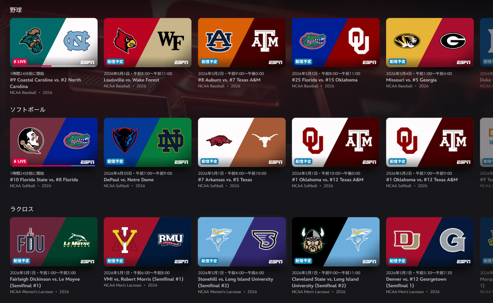 ディズニープラスでスポーツメディア『ESPN』が日本上陸! NBA、NHL、NCAA主催大会、30 for 30などが今後続々追加予定 ディズニープラスでスポーツメディア『ESPN』が日本上陸! NBA、NHL、NCAA主催大会、30 for 30などが今後続々追加予定 UZUREA News 公開:2026年4月29日(5時間前) コメント 0件 エンターテインメントVODアメリカサービススポーツディズニープラスバスケットボール野球 Post X Share Facebook B! はてブ LINE 当記事の内容および記事中のリンクには、広告目的や当サイトが収益を得るためのものが含まれており、これらの収益によってuzurea.netは運営されています。 動画配信サービスディズニープラスで(Disney+)でサブスク加入者向けに、アメリカ発の世界最大級スポーツ専門メディア『ESPN』のコンテンツ日本国内でも見られるようになりました! 記事の索引1 ディズニーのグローバル戦略が新フェーズへ、世界約100市場で『ESPN on Disney+』を展開拡大1.1 『ESPN』とは? スポーツメディアの巨人が日本でも視聴可能に1.2 配信スタート&配信予定のラインナップについて1.3 リトルリーグ・ワールドシリーズ/サバンナ・バナナズ1.4 30 for 30(スポーツドキュメンタリー)1.5 ESPN FC(サッカー情報番組)1.6 韓国eスポーツ協会(KeSPA)主催イベント1.7 ディズニープラス について2 関連リンク ディズニーのグローバル戦略が新フェーズへ、世界約100市場で『ESPN on Disney+』を展開拡大 ウォルト・ディズニー・カンパニーは、欧州およびアジア太平洋(APAC)の53の国と地域で『ESPN on Disney+』の提供を始めました。 Greatest | ESPN on Disney+ Greatest | ESPN on Disney+※動画は2025年に英語圏向けに公開されたプロモーション 今回の施策で、映画・ドラマとスポーツ配信を1つのアプリに集約されます。日本・韓国・台湾では今のところ“初期フェーズ”との事で、英語中心での提供となりますが、ディズニープラスの月額サブスクリプション契約者は追加料金なしで利用・視聴可能です。 配信内容は段階的に拡充される予定。試合中継だけでなく、関連ニュースやドキュメントなど、様々なスポーツを包括的に楽しめる巨大サービスとしての期待が高まります。 配信開始日:2026年4月8日 価格:現在のディズニープラス契約プランに含まれる(追加料金なし) 配信場所:『ディズニープラス(Disney+)』アプリ内 対応言語:初期フェーズでは英語で提供 ディズニープラスにおけるESPNのグローバル展開を拡大 ディズニープラス公式リリース ESPNが配信開始!いつでも、どこでもスポーツを楽しもう Disney+(ディズニープラス)ナビ ディズニープラス(Disney+)トップページへ ディズニープラス詳細&申し込みページ 映画好きにおススメHuluとDisney+セットプラン月1,690円から 詳細チェック バラエティ好きにおススメABEMAとDisney+セットプラン月1,470円から 詳細チェック 『ESPN』とは? スポーツメディアの巨人が日本でも視聴可能に ディズニープラス ESPNページ スクリーンショット 正式名称は『Entertainment and Sports Programming Network』。1979年にアメリカで開局したスポーツ専門チャンネルで、1996年にディズニーがESPNの親会社であるABCを買収したことでグループ傘下に入りました。 アメリカ本国では、ディズニープラス・Hulu・ESPN+の配信3サービスをセットにしたバンドル提供が一般的で、生活に密着した存在として定着しています(いずれもディズニー傘下のサービス。なお、日本で提供されている『Hulu』は別運営のサービス)。 単なる中継局にとどまらず、ニュース番組『SportsCenter』や分析、ドキュメンタリーを通じて“スポーツの見方”そのものを作り上げてきたブランドでもあります。 ESPN公式サイト(英語) 配信スタート&配信予定のラインナップについて 現時点の日本は『初期フェーズ』という位置づけで、視聴できるコンテンツは今後段階的に拡充されていく予定です。日本におけるフルローンチの時期は、決定次第改めてアナウンスされるとのこと。 以下は公式発表に記載されているラインナップと、実際に公開スタートしているもの。英語音声のみでの提供が前提となりますが、最新の映像・情報を楽しめるのはスポーツファンにとっては嬉しい所です。 NBA/NHL(2026-27シーズンより) アメリカの2大プロスポーツリーグ、バスケットボールの『NBA』とアイスホッケーの『NHL』が、いずれも2026-27シーズンから配信対象に加わる予定です。 日本での『NBA』の認知度はすでに高く、ディズニープラスから直接観戦できる環境が整うのは、ファンにとって大きな変化になるでしょう。『NHL』は日本での配信機会がこれまで少なかっただけに、アイスホッケーファンにとっては注目のニュースです。 NCAA主催大会(マーチ・マッドネス、カレッジフットボールほか) 全米大学体育協会(NCAA)が主催する各種大会が配信対象に含まれています。 公式発表ではマーチ・マッドネス(全米大学バスケットボール選手権)やカレッジフットボール関連が言及されていますが、実際のディズニープラス上の配信ページを見ると、対象競技の幅広さは想像以