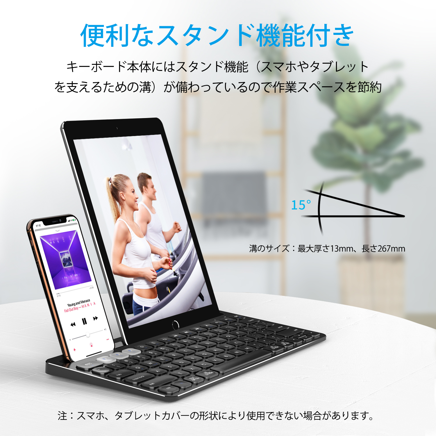 キーボード上部には厚さ13mm、長さ267mmの溝を設けており、スマートフォンやタブレットを設置する事ができます。ビジネスシーンに映えるよう、ブラックを基調とした高級感あるデザインに仕上げました。