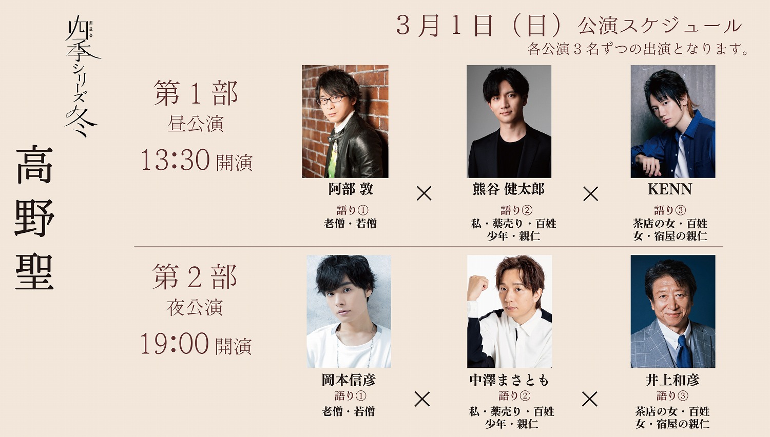 井上和彦演出『朗読会四季シリーズ 冬 高野聖』 11名の出演者による和装ビジュアルと配役が解禁 井上和彦演出『朗読会四季シリーズ 冬 高野聖』 11名の出演者による和装ビジュアルと配役が解禁 UZUREA News 公開:2026年2月17日(13時間前) コメント 0件 エンターテインメントイベント声優小説本舞台井上和彦 Post X Share Facebook B! はてブ LINE 当記事の内容および記事中のリンクには、広告目的や当サイトが収益を得るためのものが含まれており、これらの収益によってuzurea.netは運営されています。 井上和彦が演出を手がける朗読舞台『朗読会四季シリーズ 冬 高野聖』の出演者11名による和装ビジュアルおよび配役の詳細が解禁されました。本公演は2026年2月28日(土)・3月1日(日)の計4公演、東京・品川プリンスホテル クラブeXにて開催予定です。 チケットは一般席9,800円(税込)から複数のカテゴリが用意されています。また、見切れ席5,000円(税込)が追加されました。 ※なお、当初出演が予定されていた鈴村健一さんは体調不良のため休演される事が発表されています。 記事の索引1 『朗読会四季シリーズ最終回 冬 高野聖』 全11名の声優陣による和装姿と日替わり配役が決定1.1 『朗読会四季シリーズ 冬 高野聖』出演者和装ビジュアル一覧2 公演日程と日替わりキャスト・配役詳細3 公演概要4 関連リンク 『朗読会四季シリーズ最終回 冬 高野聖』 全11名の声優陣による和装姿と日替わり配役が決定 朗読舞台『朗読会四季シリーズ 冬 高野聖』の出演者11名による和装ビジュアルおよび配役が解禁されました。 朗読舞台『朗読会四季シリーズ 冬 高野聖』 シリーズを締めくくる最終公演として上演される本作は、泉鏡花の短編小説『高野聖』を題材とした朗読舞台です。あわせて、日替わりで登場するキャストの具体的な配役も明らかになりました。 『朗読会四季シリーズ』は、春・夏・秋・冬の4公演を1年にわたり展開してきたプロジェクト。完結編となる『冬 高野聖』では、日本語の美しさと泉鏡花作品特有の幻想性を音と言葉のみで描き出す朗読劇です。 公演は2026年2月28日(土)・3月1日(日)の計4回、東京・品川プリンスホテル クラブeXにて開催予定です。チケットは一般席9,800円(税込)から複数のカテゴリが用意されています。また、見切れ席5,000円(税込)が追加されました。 朗読会 四季シリーズオフィシャルサイトへ 恒例となっている和装ビジュアルも、本作では全キャスト分を公開。作品世界に寄り添う着物姿がずらりと並び、まずはビジュアルだけでもしっかり堪能したくなる仕上がりです。 『朗読会四季シリーズ 冬 高野聖』出演者和装ビジュアル一覧 出演者は阿部敦、石谷春貴、井上和彦、浦和希、岡本信彦、梶原岳人、熊谷健太郎、KENN、田丸篤志、中澤まさとも、野島健児(五十音順)です。 ※なお、出演を予定していた鈴村健一は体調不良のため休演となることが発表されています。 井上和彦 阿部敦 石谷春貴 浦和希 岡本信彦 梶原岳人 熊谷健太郎 KENN 田丸篤志 中澤まさとも 野島健児 解禁された和装ビジュアル 公演日程と日替わりキャスト・配役詳細 出演する11名は、各日3名ずつの日替わり制で登場します。配役は『語り①(老僧・若僧)』『語り②(私・薬売り・百姓・少年・親仁)』『語り③(茶店の女・百姓・女・宿屋の親仁)』の3カテゴリに分かれ、公演ごとに異なる組み合わせとなっています。 公演日程と日替わりキャスト・配役詳細 公演語り①(老僧・若僧)語り②(私・薬売りほか)語り③(茶店の女ほか)2月28日(土)1部井上和彦田丸篤志石谷春貴2月28日(土)2部浦和希梶原岳人野島健児3月1日(日)1部阿部敦熊谷健太郎KENN3月1日(日)2部岡本信彦中澤まさとも井上和彦 公演概要 タイトル:『朗読会四季シリーズ 冬 高野聖』 演出:井上和彦 開催日:2026年2月28日(土)・3月1日(日) 各日2部制 会場:東京・品川プリンスホテル クラブeX(公式Webサイト) チケット料金:9,800円〜24,800円(税込) カフェシート(2名分):24,800円(税込)/和菓子・井上和彦サイン入りお品書き付き パンフレット付き最前列シート:14,800円(税込) 一般席:9,800円(税込) 見切れ席:5,000円(税込) ※新設された見切れ席を含め、チケット購入方法などの詳細は公式サイトをご参照ください。 チケット | 朗読会 四季シリーズ 朗読会 四季シリーズオフィシャルサイトへ 関連リンク 朗読会 四季シリーズ 公式Xアカウント@readingstage クラブeX公式Webサイト 井上和彦 本人Xアカウント @inouekazuhiko 井上和彦 公式ファンクラブ KAZUFUN By DMMオンラインサロン 高野聖・眉かくしの霊 (岩波文庫 緑27-1) 岩波書店 ¥627 (2026/02/17 22:01:52時点 Amazon調べ-詳細) Amazonでのレビューを見る Amazonで検索 楽天市場で検索 Yahoo!ショッピングで検索 メルカリで検索 風まかせ 声優・井上和彦の仕事と生き方 NFTデジタル特典付き 宝島社 ¥2,160 (2026/02/17 22:01:52時点 Amazon調べ-詳細) Amazonでのレビューを見る Amazonで検索 楽天市場で検索 Yahoo!ショッピングで検索 メルカリで検索