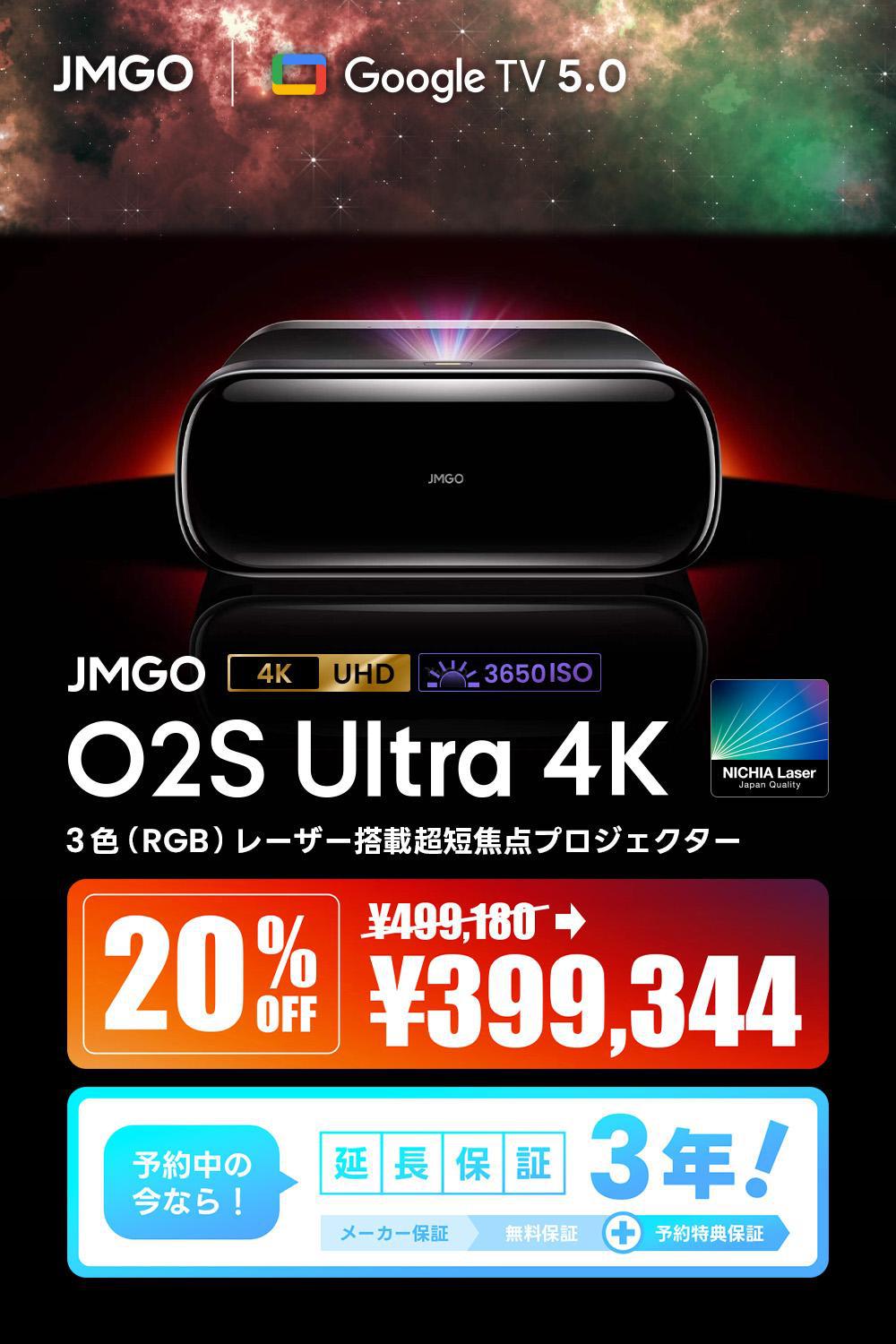 JMGO『O2S Ultra 4K』 世界初Google TV5.0搭載プロジェクター 2025年10月7日より予約開始 JMGO『O2S Ultra 4K』 世界初Google TV5.0搭載プロジェクター 2025年10月7日より予約開始 UZUREA News 公開:2025年10月3日(19時間前) コメント 0件 ハードウェアAV機器TVハードウェアホームシアター家電製品製品情報 Post X Share Facebook B! はてブ LINE 当記事の内容および記事中のリンクには、広告目的や当サイトが収益を得るためのものが含まれており、これらの収益によってuzurea.netは運営されています。 JMGO(ジェイエムゴー)の最新プロジェクター『O2S Ultra 4K』が、2025年10月7日より日本で予約受付を開始します。本製品は“世界初”となるGoogle TV 5.0を搭載し、3色レーザーによる3650ISOルーメンの高輝度、わずか15cmの距離で100インチ投影が可能な超短焦点プロジェクター。 本体単体の通常価格は499,180円ですが、2025年10月7日(火)~11月17日(月)の期間限定で20%OFFの発売記念価格で販売されます。 記事の索引1 JMGO『O2S Ultra 4K』が10月7日より予約開始1.1 O2S Ultra 4K 主な特徴1.2 O2S Ultra 4K スペック1.3 予約特典と予約限定割引1.4 無料体験会も開催2 関連リンク JMGO『O2S Ultra 4K』が10月7日より予約開始 世界初のGoogle TV 5.0を搭載したJMGO(ジェイエムゴー)の最新4Kプロジェクター『O2S Ultra 4K』が、10月7日より日本で予約受付を開始します。価格は499,180円(税込)。 JMGO『O2S Ultra 4K』が10月7日予約開始 『O2S Ultra 4K』は、RGBレーザーエンジン『MALC3.0』によって3650 ISOルーメンの高輝度を実現。昼間でも鮮明な大画面投影を可能にします。わずか15cmの距離で100インチを投射できる超短焦点設計(投射比0.16:1)は業界最短クラスで、設置場所を選びません。 AI自動補正や自動ピント調整を搭載し、操作もシンプル。Dolby VisionやHDR10への対応に加え、DYNAUDIO製スピーカーを内蔵しており、映像だけでなく音響体験も強化されています。 手軽に持ち運べる本格シネマ体験 『O2S Ultra 4K』は、映像ファンにとってはもちろん、大画面でゲームを楽しみたい人にとっても理想の一台。自宅を一瞬で映画館へと変える、新時代のプロジェクターです。 JMGO O2S Ultra 4KJMGO 日本公式 O2S+VIVIDSTROMセットJMGO 日本公式 O2S+Liberty WideセットJMGO 日本公式 O2S Ultra 4K 主な特徴 O2S Ultra 4K 主な特徴 JMGO独自の3色レーザーエンジンMALC3.0で従来比30%の光学効率アップ 色域BT.2020を110%超でカバー、コントラスト比4000:1 AI双眼視覚システムによる自動ピント合わせ&スクリーン補正 Dolby Atmos・DTS:X対応で、映像と音をシアター級に再現 わずか4.5kg、ノートPCサイズで持ち運びも容易 O2S Ultra 4K スペック O2S Ultra 4K スペック 製品名:JMGO O2S Ultra 4K サイズ:幅312×奥行290×高さ140mm 重量:約4.5kg 投影方式:DLP方式 解像度:4K UHD(3840×2160) 明るさ:3650 ISOルーメン 色域:BT.2020 超110% 光源:RGB 3色レーザー スピーカー:DYNAUDIO製10W×2基 OS:Google TV 5.0(世界初搭載) 接続:HDMI / USB / Wi-Fi / Bluetooth 予約特典と予約限定割引 予約特典と予約限定割引 『O2S Ultra 4K』はJMGO公式サイトでの限定販売で、予約販売期間は2025年10月7日(火)~11月17日(月)となります。予約特典として20%OFFの割引と、メーカー保証1年+延長保証2年の合計3年間保証が付与されます。 『O2S Ultra 4K』単体 499,180円 → 399,344円(税込) O2S+VIVIDSTORMセット 697,180円 → 557,744円(税込) O2S+Liberty Wideセット 796,180円 → 636,944円(税込) JMGO O2S Ultra 4KJMGO 日本公式 O2S+VIVIDSTROMセットJMGO 日本公式 O2S+Liberty WideセットJMGO 日本公式 無料体験会も開催 無料体験会も開催 実際に『O2S Ultra 4K』を体感できる無料イベントが東京・渋谷で開催されます。来場特典として、当日予約者から抽選で『Liberty Wideスクリーン(約40万円相当)』が3名に、さらにアンケート回答者から抽選で1名にJMGOプロジェクターがプレゼントされます。 日時:2025年10月24日(金)13:00~19:00/10月25日(土)11:00~17:00 会場:JMGO Japan(東京都渋谷区千駄ヶ谷3-5-7 2F) 参加費:無料 なおJMGOの発売済みプロジェクターは、2025年10月4日からのプライム感謝祭で30%OFFセールを予定しています。対象商品と価格などこちらの記事に掲載しています! 関連リンク JMGO(ジェイエムゴー)公式サイト JMGO Japan(@JMGOjp) / X JMGO N1S 3色レーザー プロジェクター【Google TV搭載/Netflix公式APP使用可 / 850ISOルーメン / ジンバル一体型/スタンド内蔵/オートフォーカス/リアルタイム補正/全自動台形補正 / 180インチ投影 / 小型 / 10Wスピーカー / 家庭用/天井 高輝度 / 2年保証】 JmGO ¥149,380 (2025/10/03 21:28:09時点 Amazon調べ-詳細) Amazonでのレビューを見る Amazonで検索 楽天市場で検索 Yahoo!ショッピングで検索 メルカリで検索 JMGO PicoPlay+ 縦投影可能コンパクトプロジェクター 【Google TV搭載/Netflix公式APP使用可 / 450ISOルーメン / 回転できるボトル型/オートフォーカス/リアルタイム補正/全自動台形補正/小型 / 8Wスピーカー / 家庭用/低遅延/天井/静音 / 2年保証】 JmGO ¥78,980 (2025/10/03 21:28:09時点 Amazon調べ-詳細) Amazonでのレビューを見る Amazonで検索 楽天市場で検索 Yahoo!ショッピングで検索 メルカリで検索