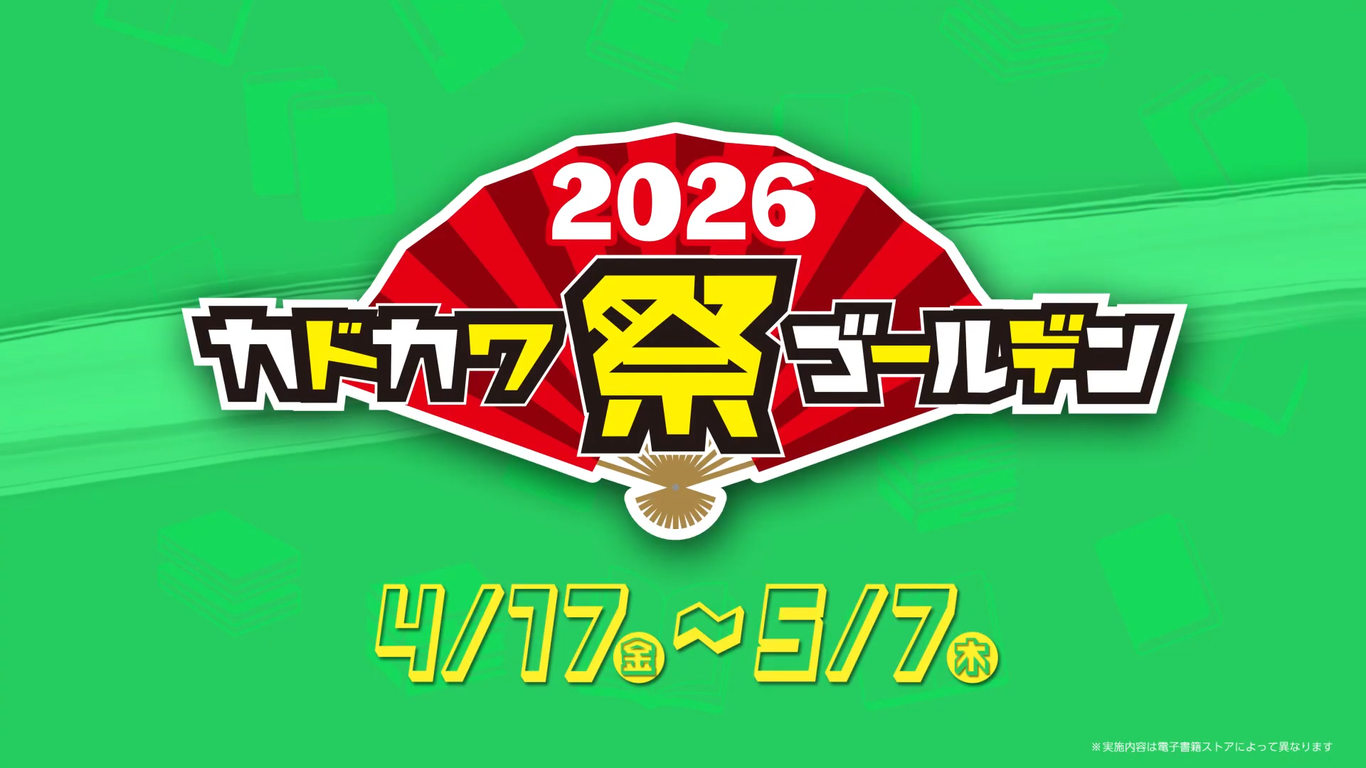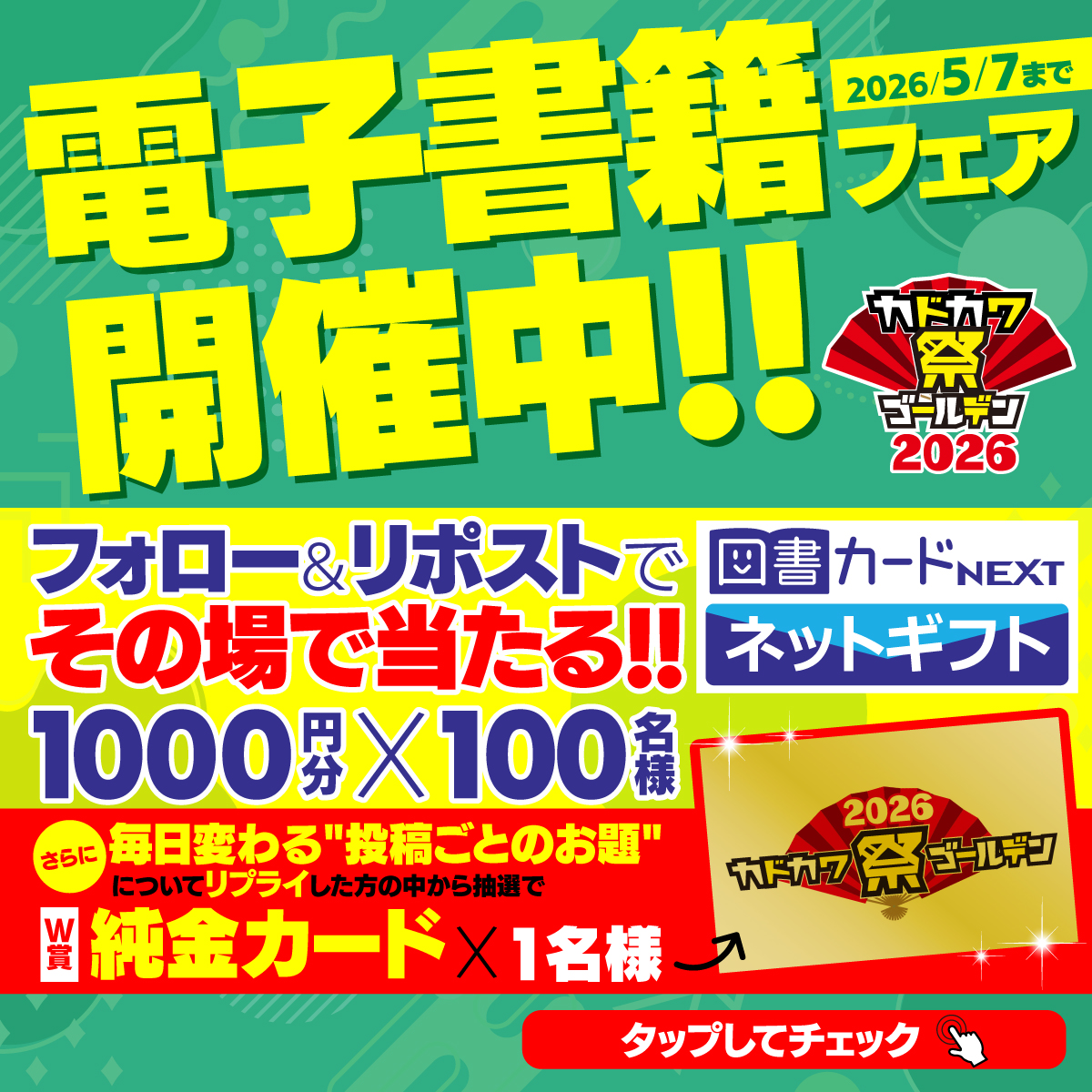 カドカワ祭ゴールデン2026キャンペーン公式サイト( https://promo.kadokawa.co.jp/campaign/golden/ )より 『カドカワ祭ゴールデン2026』4月17日~5月7日開催 50%OFF・1巻無料・Xキャンペーンなど UZUREA News 公開:2026年4月18日(3時間前) コメント 0件 セール・クーポン漫画・アニメKindleキャンペーンセール情報ライトノベル小説漫画電子書籍 Post X Share Facebook B! はてブ LINE 当記事の内容および記事中のリンクには、広告目的や当サイトが収益を得るためのものが含まれており、これらの収益によってuzurea.netは運営されています。 KADOKAWAによる大型電子書籍フェア『カドカワ祭ゴールデン2026』が、2026年4月17日(金)より5月7日(木)まで開催されます(一部企画は終了日が異なります)。 Amazon Kindleをはじめとする38ストアで電子書籍の50%OFF販売や1巻無料公開が行われるほか、純金カードや図書カードネットギフトが当たる公式Xキャンペーンなども同時開催されています。 記事の索引1 GWの読書を支援!『カドカワ祭ゴールデン2026』が4月17日~開幕2 主要電子書籍ストアでの50%OFF&シリーズ1巻無料キャンペーン2.1 実施予定電子書籍ストア2.2 Amazon Kindleストアおすすめ(第1弾割引&無料は4月30日まで)3 『カドコミWEB』にて合計182作品の1巻を無料公開4 純金カードや図書カードが当たる公式Xキャンペーン5 関連リンク GWの読書を支援!『カドカワ祭ゴールデン2026』が4月17日~開幕 連休の読書機会に合わせ、KADOKAWAが『カドカワ祭ゴールデン2026』を展開します。 『カドカワ祭ゴールデン2026』 画像は公式動画より ゴールデンウィークのタイミングに合わせて開催される本キャンペーンは、電子書籍をより身近に、そしておトクに楽しめる豪華企画を展開。各電子書籍ストアでの大規模セールに加え、コミックポータルでの無料公開、SNSを活用した参加型キャンペーンなどが開催されます。 期間は2026年4月17日(金)より、5月7日(木)まで。キャンペーン公式サイトでは、多数のキャンペーンが紹介されています。 ※一部企画では終了日が異なります。 カドカワ祭ゴールデン2026キャンペーン公式サイト 主要電子書籍ストアでの50%OFF&シリーズ1巻無料キャンペーン 今回のフェアの中心となるのが、KADOKAWA作品の電子書籍50%OFF販売と、シリーズ1巻目の期間限定無料公開です。 主要電子書籍ストアでの50%OFF&シリーズ1巻無料キャンペーン 画像はAmazonより 対象となるのはBOOK☆WALKER、Amazon Kindleストアをはじめとする計38ストア。開始は2026年4月17日(金)からで、各ストアによって終了日が異なる点には注意。実施予定ストアは以下のとおりです。 実施予定電子書籍ストア BOOK☆WALKER/Amazon Kindleストア/Amebaマンガ/Apple Books/comipo/DMMブックス/dアニメストア/dブック/ebookjapan/FOD/Google Play ブックス/honto Huluコミックサービス/LINEマンガ/music.jp/pixivコミック/Reader Store/Renta!/U-NEXT/アニメイトブックストア/紀伊國屋書店Kinoppy/コミックROLLY/コミックシーモア スマートブックストア/ゼブラック/ソク読み/ニコニコ漫画/ピッコマ/ブックパス/ブックライブ/ブッコミ/ぼるコミ/マンガBANG/まんがセゾン/マンガボックス/まんが王国/漫画全巻ドットコム/楽天Kobo電子書籍ストア Amazon Kindleストアおすすめ(第1弾割引&無料は4月30日まで) マンガ カラオケ行こ!¥693 → ¥308(44%OFF) 異世界おじさん 1¥660 → 無料(期間限定無料) ライトノベル・小説 奴隷からの期待と評価のせいで搾取できないのだが¥1,430 → ¥715(50%OFF) 友達がタイムマシンを作ったので【電子特別版】¥1,760 → ¥880(50%OFF) カドカワ祭ゴールデン2026 第1弾Amazon Kindleストア 『カドコミWEB』にて合計182作品の1巻を無料公開 『カドコミWEB』にて合計182作品の1巻を無料公開 画像はカドコミより KADOKAWAのコミックポータルサイト『カドコミWEB』では、期間中に182作品のシリーズ1巻が期間限定で無料公開されます。実施期間は2026年4月17日(金)から5月8日(金)までです。 『カドコミ』は、アカウント登録不要で読み始められる点も魅力です。 カドカワ祭ゴールデン2026 第1弾カドコミ (コミックウォーカー) 純金カードや図書カードが当たる公式Xキャンペーン フェアの開催に合わせ、公式X(@kadokawa_san)でも参加型キャンペーンが実施されています。内容はリポスト形式とリプライ形式の2種類です。 純金カードや図書カードが当たる公式Xキャンペーン 画像は公式サイトより リポストキャンペーンでは、公式アカウントをフォローのうえ、毎日投稿される対象ポストをリポストした方の中から抽選で100名に『図書カードネットギフト1,000円分』がプレゼントされます。 リプライキャンペーンでは、毎日出題される質問にリプライで回答した方の中から、抽選で1名に『カドカワ祭ゴールデン2026』のロゴがデザインされた『純金カード』が贈られます。 いずれのキャンペーンも実施期間は2026年4月17日(金)から5月7日(木)11:59までとなっています。キャンペーン詳細については下記リンクを参照してください。 「カドカワ祭ゴールデン2026 Xキャンペーン」 応募要項KADOKAWA カドカワ祭ゴールデン2026キャンペ