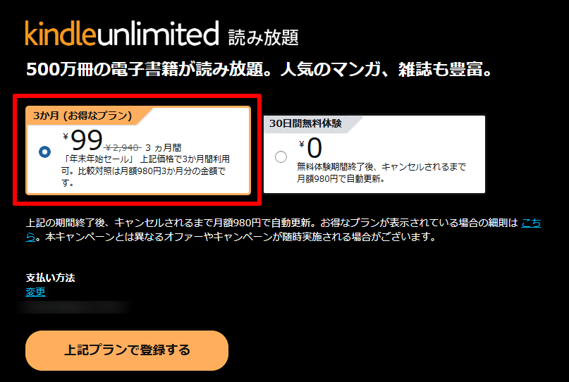 Amazon『Kindle Unlimited 3か月間99円』電子書籍読み放題が【超お得】になるキャンペーン 1月6日まで開催 Amazon『Kindle Unlimited 3か月間99円』電子書籍読み放題プランが【超お得】になるキャンペーン 1月6日まで開催 UZUREA News 公開:2025年12月28日(3時間前) コメント 0件 セール・クーポンAmazonKindleキャンペーンサービスサブスクリプションセール情報本漫画 Post X Share Facebook B! はてブ LINE 当記事の内容および記事中のリンクには、広告目的や当サイトが収益を得るためのものが含まれており、これらの収益によってuzurea.netは運営されています。 Amazonの電子書籍読み放題プラン、『Kindle Unlimited(キンドル・アンリミテッド)』に新規登録すると、通常3か月で2,940円(980円/月)となる利用料金が3か月99円となるキャンペーンが開催。 2025年12月26日~2026年1月6日の期間に申し込んだ『新規利用者』が対象となります。 記事の索引1 Amazon『Kindle Unlimitedキャンペーン』 お得なプランで電子書籍が読み放題1.1 Kindle Unlimited対象 コミック1.2 Kindle Unlimited対象 ビジネス書1.3 Kindle Unlimited対象 雑誌1.4 Kindle Unlimited とは2 関連リンク Amazon『Kindle Unlimitedキャンペーン』 お得なプランで電子書籍が読み放題 Amazonが『Kindle Unlimited』の超お得なキャンペーンを実施中です。 Amazon『Kindle Unlimitedキャンペーン』 『Kindle Unlimited』は、500万冊以上の電子書籍が読み放題になる人気のサブスクリプションサービス。通常は月額980円ですが、今回のキャンペーンでは新規登録者限定で、3か月間わずか99円で利用できます。 通常なら3か月で2,940円かかるところが99円になるので、約97%オフという驚きの割引率。キャンペーン期間は2025年12月26日(金)10:00〜2026年1月6日(火)23:59まで。 キャンペーンページを開いた際に『お得なプラン』が表示されていれば対象ユーザーとなります。 お得なプランの表示画像はAmazonより Kindle Unlimited キャンペーン申込はこちら Kindle Unlimited対象 コミック 2026年冬アニメ原作ゴールデンカムイ 2026年冬アニメ原作デッドアカウント 2026年冬アニメ原作青のミブロ 2026年冬アニメ原作炎炎ノ消防隊 2026年冬アニメ原作うるわしの宵の月 2026年冬アニメ原作終末のワルキューレ 2026年冬アニメ原作多聞くん今どっち!? 2026年冬アニメ原作違国日記 チハヤリスタート! 石神戦記 Kindle Unlimited対象 ビジネス書 スモールビジネス起業の教科書_Webサービス事業編 ビジネスに役立つ 教養としての映像/動画 Kindle Unlimited対象 雑誌 Oggi (オッジ) 2026年 2月号 Casa BRUTUS(カーサ ブルータス) 2026年 1月号 Kindle Unlimited とは Kindle Unlimited 『Kindle Unlimited』とは、Amazonが運営する電子書籍読み放題サブスクリプションサービス。通常月額980円で小説、ビジネス本、実用書、コミック、雑誌、洋書など幅広いジャンルから好きな本を好きなだけ楽しむことができます。 本サービスは、『Kindle』端末だけでなく、スマートフォンやタブレット、PC/Macの『Kindleアプリ』でも利用が可能。また、マンガ作品に関してはブラウザ上で『マンガ本棚』を開くことでも利用できます。 雑誌は人気コミックなどは序盤の1~3巻までがUnlimited対象になっているので、面白い漫画を探すのに iOS版Kindleアプリ android版Kindleアプリ PC/Mac版Kindleアプリ Kindle Unlimited キャンペーン申込はこちら Amazonプライム会員 月額600円30日無料体験詳細はこちら 学生なら 月額300円!6か月間無料体験Prime Studentへ 関連リンク Kindle本 電子書籍 | Amazon AmazonJPKindle(アマゾン)(@AmazonJPKindle) / X(Twitter) Amazon.co.jp About Amazon Japan Amazon News JP(@AmazonNewsJP) / X(Twitter) Amazon.co.jp (アマゾン)|Facebook Amazon Japan (アマゾンジャパン)(@amazonjapan) • Instagram Amazon Japan Official – YouTubeチャンネル