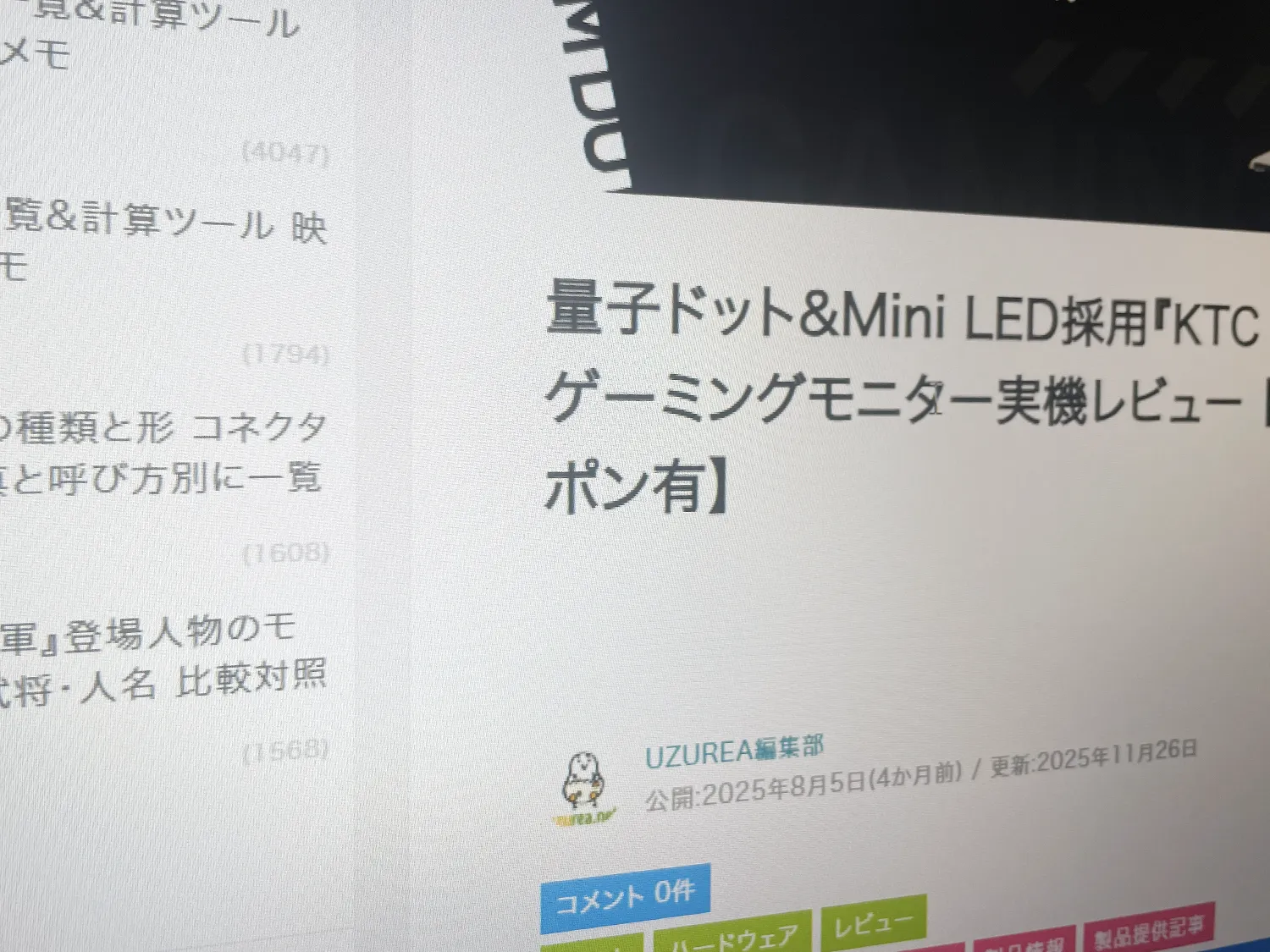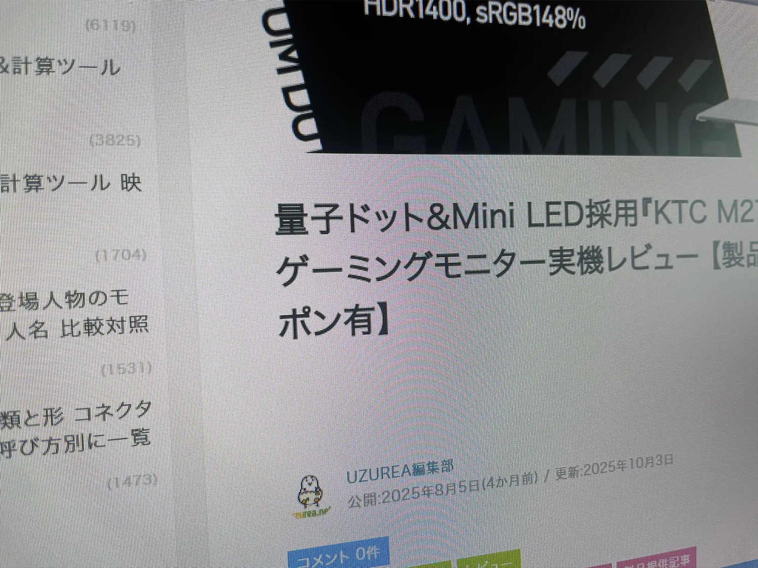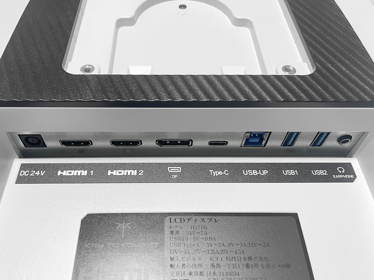 『KTC H27P6』 4K/160Hz、FHD/320Hz デュアルモード搭載 27インチゲーミングモニター 実機レビュー 『KTC H27P6』 4K/160Hz、FHD/320Hz デュアルモード搭載 27インチゲーミングモニター 実機レビュー【製品提供記事 ブラックフライデークーポン掲載中】 評価:4 UZUREA編集部 公開:2025年11月26日(10時間前) コメント 0件 ハードウェアレビューPCゲーム映像製品情報製品提供記事 Post X Share Facebook B! はてブ LINE 当記事の内容および記事中のリンクには、広告目的や当サイトが収益を得るためのものが含まれており、これらの収益によってuzurea.netは運営されています。 KTCの『H27P6』は、4Kで最大160Hz、FHDでは最大320Hzという“2つのモードを切り替えて使える” デュアルモード対応の27インチゲーミングモニター。日本国内では2025年10月から発売され、参考価格価格は62,980円(税込)となっていますが、セール時には4万円台で販売されていています。 PCでの日常的な作業や4Kでの動画視聴、そしてFPSなど高リフレッシュレートが必要なゲームプレイをすべて1台のモニターで対応したい方におすすめの製品です。 記事の索引1 『KTC H27P6』 27インチFAST IPSゲーミングモニター レビュー1.1 H27P6製品スペック1.2 開封・組み立て、各部のチェック1.3 スタンドの可動域とエルゴノミクス1.4 外観1.5 画質・解像度など表示をチェック2 まとめ・総合評価3 KTCモニター Amazon購入時に使える クーポンコード3.1 プロモーションコード対象商品一覧3.2 プロモーションコードの利用方法4 関連リンク・関連商品 『KTC H27P6』 27インチFAST IPSゲーミングモニター レビュー 『KTC H27P6』 27インチFAST IPSゲーミングモニター 当記事で紹介する『KTC H27P6』は…… 4K(3840×2160) リフレッシュレート160Hz=映画・アニメなどの動画視聴や、コンソールゲームのプレイ、そのた一般的なPC作業に適した高解像度モード フルHD(1920×1080) リフレッシュレート320Hz=FPS/TPSなど入力遅延の少なさを重視したい、エキスパートゲーマー向けモード という2つのモードを切り替えて利用できる『デュアルモード』搭載の液晶モニター。これを含めて、本製品の位置づけと特徴は以下のとおり。 ゲーム・映像視聴・クリエイティブ作業など幅広い用途で一定のパフォーマンスを得られるバランス型モデル 設置は簡単、使用時にはパネルの上下左右の角度はもちろん、縦画面へも片手でササっと動かせるエルゴノミクス設計で使用感は抜群 それでいて4万~5万円台で購入(セール時など)できるコストパフォーマンスの良さ とにかく、価格に足してのパフォーマンスは抜群ですが、あえて難点を挙げるとするなら内蔵スピーカーが無いので、新しい環境を構築するときや、スピーカー付きモニターからの買い替えを検討している方はご注意を。 KTC H27P6 27インチ 4K UHDゲーミングモニター FAST IPS 3840×2160@160Hz /FHD@320Hz デュアルモード KTC ¥62,980 (2025/11/26 19:44:00時点 Amazon調べ-詳細) Amazonでのレビューを見る Amazonで検索 楽天市場で検索 Yahoo!ショッピングで検索 メルカリで検索 H27P6製品スペック 続いてカタログスペックをチェックしておきましょう。各データはKTC公式サイトやAmazon製品情報、付属マニュアルの情報などをまとめています。 型番H27P6パネルサイズ27インチアスペクト比16:9パネルタイプFast IPSコントラスト比1000:1(Typ.)可視領域596.16(H) × 335.34(V) mm輝度400cd/㎡(Typ.)応答時間5ms(Typ.)最大解像度4K:3840×2160FHD:1920×1080リフレッシュレート4K:最大160HzFHD:最大320Hz視野角178°(H±89°、V±89°Typ.)ピクセルピッチ0.15525mm × 0.15525mm表示色8bit + Hi-FRC(最大約10.7億色)色域カバー率NTSC 1931:色域容積約 89%、色域カバー率 82%Adobe RGB CIE 1976:色域容積 105%、色域カバー率 93%DCI-P3 CIE 1976:色域容積 97%、色域カバー率 95%sRGB CIE 1931:色域容積 125%、色域カバー率 99%HDRDisplayHDR 400相当対応(HDR400)入出力端子HDMI 2.0×2(※2)DisplayPort 1.4×1(※2)USB 2.0×1USB 3.0×1USB Type-C×1 最大90W給電+映像(※2)+データイヤホン出力×1入力電源DC 24V/7A消費電力168W以下待機時消費電力0.5W以下環境要件大気圧:86 kPa 〜 106 kPa動作温度および湿度:0℃〜40℃、30%〜90%(結露なし)貯蔵温度および湿度:-20℃〜55℃、20%〜93%(結露なし)搭載機能Adaptive SyncKVM機能ローブルーライトフリッカーフリーゲーミングOSD(クロスヘア/タイマー/FPSカウンター等)スタンドチルト・スイベル・高さ調整・ピボット対応保証3年間保証 ※1.Typical/Typと表記のある箇所は通常の条件下で測定された標準的な応答時間を示す ※2.3840×2160@160Hz、1920×1080@320Hz 開封・組み立て、各部のチェック では、製品を開封していきます。梱包を開けると発泡スチロールの緩衝材に収められた本体とスタンド一式、電源アダプタ類が収納されています。 付属品 ディスプレイ本体 スタンド(支柱・台座) ACアダプター(24V/7A)+電源ケーブル 映像ケーブル(DPケーブル 1.5m ) クイックスタートガイド/マニュアル KTCの他モデル同様、接続用のケーブルはDPケーブルのみ同梱されていますので、HDMIケーブルで接続したい場合は自身で用意しておきましょう。背面は白を基調としたシンプル