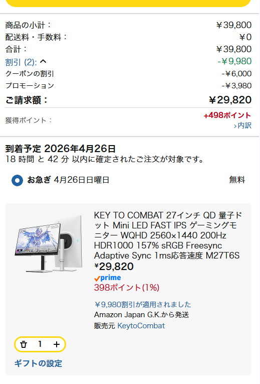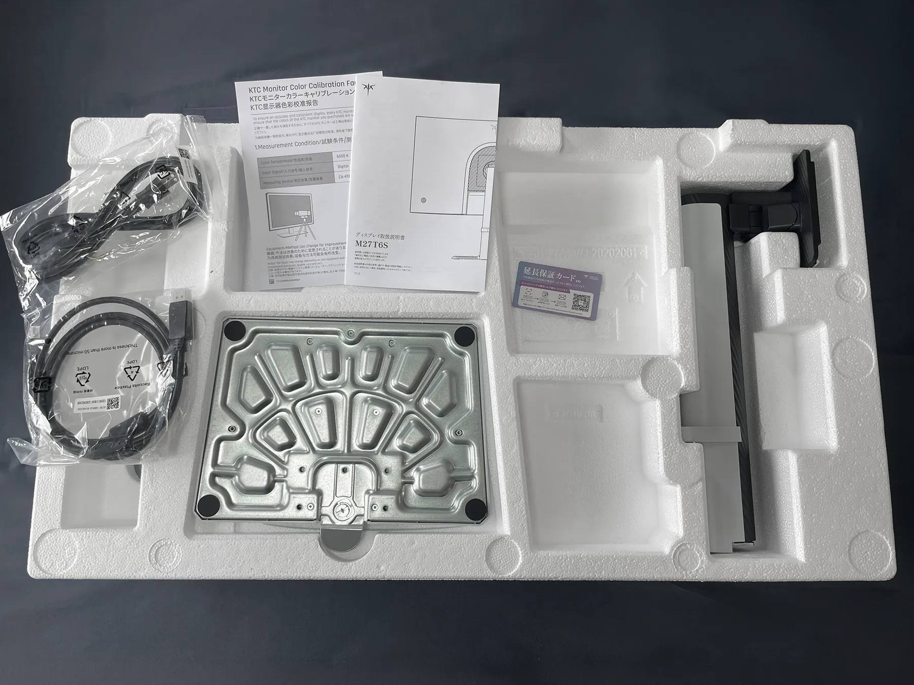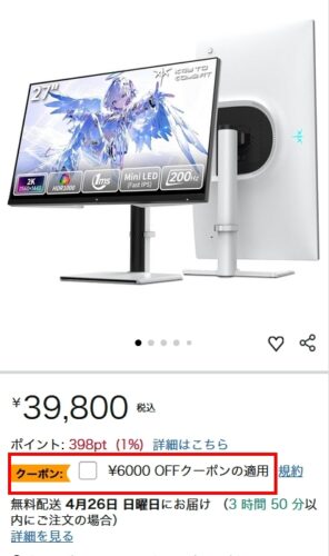 KTC『M27T6S』レビュー FAST IPS/200Hz 27インチ・ゲーミングモニター実機検証【製品提供記事】Amazonで使える 10%OFFクーポン 評価:4 UZUREA編集部 公開:2026年4月24日(5時間前) コメント 0件 ハードウェアレビューPCゲーム映像製品情報製品提供記事 Post X Share Facebook B! はてブ LINE 当記事の内容および記事中のリンクには、広告目的や当サイトが収益を得るためのものが含まれており、これらの収益によってuzurea.netは運営されています。 ディスプレイモニターを販売するKTC(Key To Combat)より、Mini LEDゲーミングモニター『M27T6S』をご提供いただきましたので、実際に2週間以上使用しスペック・使用感・発色をレビューします。 過去に当サイトでレビューした『M27T6』の末尾に『S』が付いた型番の本製品。変更点は、量子ドット+HVAパネルがFast IPSパネルに変更。リフレッシュレートは最大200Hz(210Hz OC対応)に向上し、Mini LEDバックライトは引き続き搭載。ゲームプレイやその他の業務作業まで幅広く使えるかどうかといった所までレビューしていきたいと思います。 記事の最後に、Amazonでの購入時に使える当サイト限定10%OFFクーポンコードを掲載しています。記事掲載時点の販売価格に、このコード適用すると29,820円にて本製品を購入できます! 記事の索引1 KTC『M27T6S』27インチゲーミングモニター 実機レビュー 主要スペックと特徴1.1 M27T6Sの詳細スペック1.2 M27T6・H27P6とのスペック比較・違い1.3 開封・組み立て・外観チェック1.4 画面の発色と表示品質1.5 TEST UFOでのチェック1.6 デザイン・クリエイティブ作業での使用感1.7 本体メニュー(OSD)と、ゲームアシスト機能について1.8 Amazonレビューより コイル鳴き? HDR使用時の音について2 まとめ・総合評価3 KTC M27T6S Amazonで使える 10%OFFクーポンコード3.1 プロモーションコードの利用方法4 関連リンク・関連商品 KTC『M27T6S』27インチゲーミングモニター 実機レビュー 主要スペックと特徴 Amazon販売ページより M27T6Sは、ゲーミングモニターなどを販売するKTCから販売されている27インチの液晶ディスプレイです。日本市場ではAmazonで2026年2月下旬ごろに販売スタートしています。 当記事では3月中旬にこの製品をご提供いただき、その後数週間使用してレビューを掲載してます。内容はやや長くなりますので、大まかにレビュー内容をまとめると…… Fast IPSパネルの明るい表現が〇。色彩表現も良い 高リフレッシュレート200Hzに対応 ACアダプター内蔵でケーブル類もすっきり スタンドの可動域は快適、縦画面への変更も簡単 実売通常価格 49,800円 高負荷時に、コイル鳴き(?)発生するという報告も と、いったところ。値段も含めてかなり良い製品ではないかという印象を受けました。 27インチ QD 量子ドットMini LED FAST IPS ゲーミングモニター | WQHD 2560×1440@200Hz HDR1000 157% sRGB | Freesync&Adaptive Sync | 1ms応答速度 | VESA Display| HDMI*2・DP*1 | 3年間の保証 M27T6S KEY TO COMBAT Amazonでのレビューを見る Amazonで検索 楽天市場で検索 Yahoo!ショッピングで検索 メルカリで検索 M27T6Sの詳細スペック さて、まずは詳細カタログスペックをみていきましょう。下記は、製品付属マニュアルおよびKTC公式サイトの情報を元に、当サイト(uzurea.net)がまとめたものです。 型番M27T6Sパネルサイズ27インチパネルタイプFast IPSアスペクト比16:9表示解像度2560 × 1440(WQHD)有効表示領域596.736 × 335.664mmリフレッシュレート200Hz(OC時 最大210Hz)※200Hz/210Hz(OC)を活かすにはDisplayPort接続が必要。HDMI接続時の最大リフレッシュレートは144Hz。応答時間5ms(Typ.)/ 2ms(GTG)/ 1ms(MPRT)輝度450cd/㎡(SDR Typ.)/ 1000cd/㎡(HDR Typ.)コントラスト比1000:1(Typ.)/ 1000000:1(HDR)バックライトMini LED(1152ゾーン分割)HDRHDR 1000対応色域sRGB CIE 1931:カバー率100%/色域容積157%DCI-P3 CIE 1976:カバー率98%/色域容積121%Adobe RGB CIE 1976:カバー率99%/色域容積130%NTSC CIE 1931:カバー率97%/色域容積111%※数値は平均値であり、部品のロット差や測定機器の差異により±5%の誤差が生じる可能性があります色の深さ8bit + FRC(約1.07B色)視野角±89°(H)/ ±89°(V)Typ.可視領域596.736(H)× 335.664(V)mm点距離(ピクセルピッチ)0.2331(H)× 0.2331(V)mmスクリーン表面非光沢壁穴サイズ(VESA)100mm × 100mmインターフェース×2 HDMI 2.0(2560 × 1440@144Hz)×1 DP 1.4(2560 × 1440@200Hz、最大210HzまでOC可能)×1 USB 2.0(ファームウェア更新専用)×1 イヤホン/オーディオ出力Adaptive SyncFreeSync / G-Sync Compatible入力電源100-240V〜50/60Hz 2.7A消費電力通常動作時:≦102W/スタンバイ時:≦0.5W動作温度/湿度0℃〜40℃ / 30%〜90%(結露なし)貯蔵温度/湿度-20℃〜55℃ / 20%〜93%(結露なし)本体外寸(スタンド含む)幅617mm × 高さ547mm × 奥行211mm重量約6.55kg (スタンド含む)保証期間3年間製造国中国その他VESAマウント対応(100×100mm、M4×10mmネジ)スピーカー非搭載販売ページAmazon(日本) ※Typical/Typと表記のある箇所は通常の条件下で測定された標準的な応答時間を示す M27T6・H27P6とのスペック比較・違い 続いて、前モデルとなる『M27T6』および当サイトで過去にレビューした『H27P6』と主要スペックを並べてみます。 スペックM27T6S(本製品)M27T6(前モデ