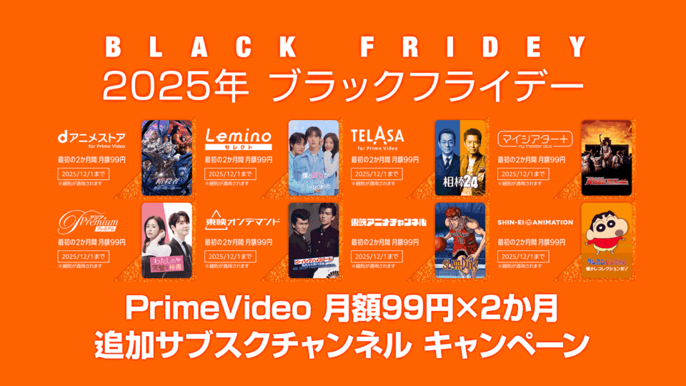 【ブラックフライデー2025】プライム・ビデオ 8つの追加サブスク 2か月間 月額99円 12/1まで UZUREA News 公開:2025年11月18日(3時間前) コメント 0件 エンターテインメントセール・クーポン漫画・アニメ2025年ブラックフライデーAmazonPrime VideoVODアニメキャンペーンサブスクセール情報動画映画配信 Post X Share Facebook B! はてブ LINE 当記事の内容および記事中のリンクには、広告目的や当サイトが収益を得るためのものが含まれており、これらの収益によってuzurea.netは運営されています。 Amazonプライム・ビデオの8つの対象追加サブスクプリプションを『2か月間 月額99円』で楽しめるキャンペーンが開催しています。これまで該当サブスクを利用したことのないユーザーが対象。 キャンペーンは2025年12月1日の申込みまで有効となっています。 この記事の後半では、『無料期間だけ楽しみたい』という方向けに、うっかり契約解除忘れを防ぐ方法を解説しています。 記事の索引1 Amazonプライム・ビデオ 8つの追加サブスクが『2か月間 月額99円』で楽しめるキャンペーン開催!1.1 dアニメストア for Prime Video1.2 TELASA for Prime Video1.3 シンエイ動画チャンネル1.4 東映アニメチャンネル1.5 マイシアタープラス1.6 アジアPremium1.7 東映オンデマンド1.8 Leminoセレクト2 『無料体験・解約し忘れ』を防ぐ方法3 2025 Amazonブラックフライデー について4 関連リンク Amazonプライム・ビデオ 8つの追加サブスクが『2か月間 月額99円』で楽しめるキャンペーン開催! Amazonプライム・ビデオにて、対象のサブスクが2か月間 月額99円で視聴できるキャンペーンが開催されています。 Amazonプライム・ビデオ 8つの追加サブスクが『2か月間 月額99円』で楽しめるキャンペーン開催! 本キャンペーンは、2025年11月14日10時00分~2025年12月1日23時59分までの間、下記の追加サブスクプリプションを『はじめて』利用開始するアカウントが対象となります。月額の利用料金や通常時の無料体験期間などはそれぞれ異なりますが、今回のキャンペーン中はいずれも2か月間 月額99円になります。 dアニメストア for Prime Video 月額437円 → 2か月間 月額99円 TELASA for Prime Video 月額990円 → 2か月間 月額99円 シンエイ動画チャンネル 月額400円 → 2か月間 月額99円 東映アニメチャンネル 月額350円 → 2か月間 月額99円 マイシアタープラス 月額385円 → 2か月間 月額99円 アジアPremium 月額550円 → 2か月間 月額99円 東映オンデマンド 月額499円 → 2か月間 月額99円 Leminoセレクト 月額550円 → 2か月間 月額99円 Amazonプライム・ビデオ追加サブスクのキャンペーンは定期的に開催されてすが、今回は開設されたばかりの『シンエイ動画チャンネル』がキャンペーンに初登場です! Amazonプライム・ビデオ 追加サブスクプリプション2か月間 月額99円 キャンペーンページへ なお、キャンペーン適用期間に一旦サブスクの継続利用を停止すれば、キャンペーン期間終了後に自動的にお金を支払ってしまう事も防げます(当記事の下部で解説あり)。 キャンペーン対象サブスクの概要は下記の通りです。 dアニメストア for Prime Video 月額437円 → 2か月間 月額99円 『dアニメストア for Prime Video』は、アニメ専門VODサイト『dアニメストア』のプライムビデオ版で、本家とほぼ同じ内容のアニメ作品を視聴することができる追加サブスク。 最新クールアニメが勢揃いしているほか、旧作も充実。 配信作品を確認 申し込みページへ 公式サイト TELASA for Prime Video 月額990円 → 2か月間 月額99円 テレビ朝日が運営するVODサービス『TELASA』のプライムビデオ出張版。 テレビ朝日の人気ドラマシリーズ『相棒』『科捜研の女』『ドクターX』『緊急取調室』や、松本清張原作ドラマの数々、『マグロ』『西部警察 SPECIAL』など日本ドラマ史に残る名作コンテンツの数々を楽しめます。 通常は初回のお試し期間のない追加サブスクなので、かなりお得です! 配信作品を確認 申し込みページへ 本家VOD『TELASA』 シンエイ動画チャンネル 月額400円 → 2か月間 月額99円 『シンエイ動画チャンネル』は、2025年6月25日に開設された追加サブスク。 シンエイ動画が制作したアニメーション作品を中心に、『クレヨンしんちゃん』や『美味しんぼ』、『おぼっちゃまくん』、『あたしンち』など、昭和から平成を彩った多数の名作アニメを見放題で楽しめるチャンネルです。 配信作品を確認 申し込みページへ シンエイ動画 公式サイト 東映アニメチャンネル 月額350円 → 2か月間 月額99円 『東映アニメチャンネル』は、懐かしの名作から最新作まで幅広いアニメを楽しめる追加サブスクです。 主な配信作品には『ドラゴンボール』シリーズ、『ワンピース』、そして『プリキュア』シリーズなど多彩なジャンルのアニメが揃い、子供から大人まで楽しめる内容となっています。 配信作品を確認 申し込みページへ マイシアタープラス 月額385円 → 2か月間 月額99円 『マイシアタープラス』は、映画やドラマを幅広く楽しめる追加サブスクです。 特にアート系や単館上映作品が豊