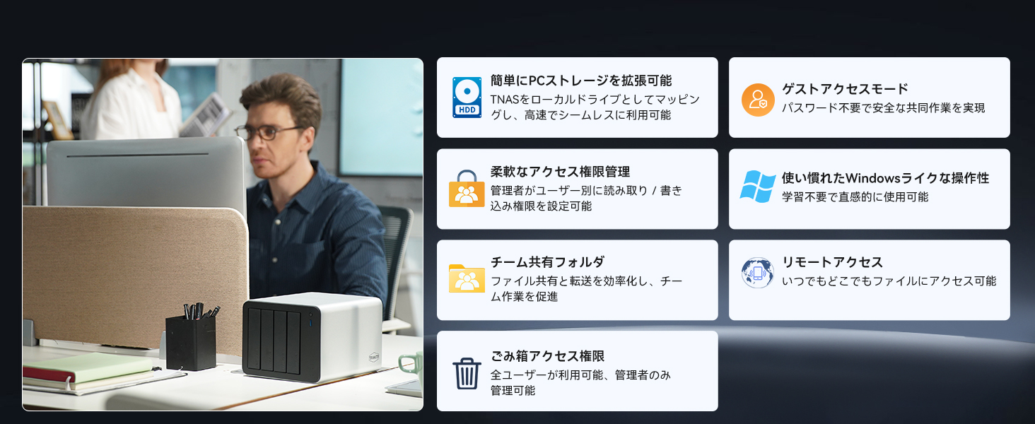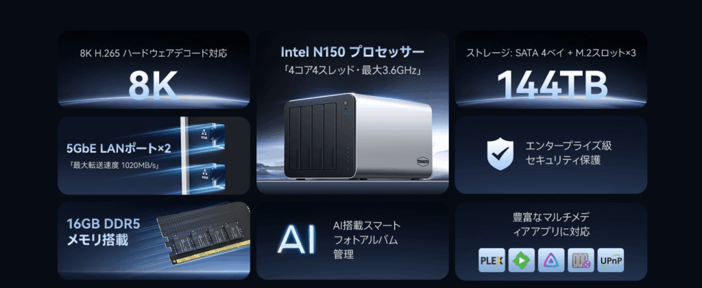 F4-425 Plus この製品のレビューはまだありません、こちらからレビューを投稿できます。 3+4ベイ ハイブリッド型ネットワークストレージ PC周辺機器 提供・発売:TERRAMASTER 公開:2025年10月24日(1か月前) F4-425 Plus公式サイト 詳細 F4-425 Plus:144TB ハイブリッドNAS、デュアル5GbE高速通信、新AIプライバシーベンチマーク 高性能仕様:Intel N150クアッドコアプロセッサー(最大3.6GHz)、16GB DDR5 RAM、デュアル5GbEポートを搭載し、ネットワーク速度を2倍に向上 先進的な設計:3つのM.2 SSDスロット(各8TB対応)と4つのSATAドライブ(各30TB対応)を備え、4K動画プロジェクトから大規模な写真ライブラリまで、大容量かつ信頼性の高いストレージソリューションを提供 包括的なバックアップソリューション:Duple Backup、Centralized Backup、TerraSyncマルチデバイス同期、CloudSyncリカバリー、スナップショットによるランサムウェア保護など、柔軟で安全なデータ管理を実現 高いコストパフォーマンス:同等製品と比較し、より優れた性能ながら手頃な価格を実現 AI搭載写真管理:ローカルAIアルゴリズムにより、顔、ペット、被写体、風景を認識し、クラウドアップロードなしでプライバシーを守りながらアルバムを自動作成 販売価格・ライセンス価格 95,990円 Amazon 販売ページ 製品スペック プロセッサーモデル:Intel® N150(クアッドコア) アーキテクチャ:x86 64ビット 動作周波数:最大ブースト 3.6GHz CPUシングルコアスコア:記載なし ハードウェアトランスコード:対応(H.264 / H.265 / MPEG-4 / VC-1、最大解像度 4K[4096×2160]、最大60fps) システムメモリ:16GB DDR5 non-ECC SODIMM 事前搭載メモリ:16GB DDR5 non-ECC SODIMM(16GB×1) メモリスロット数:1(DDR5 SODIMM) 最大サポートメモリ:32GB DDR5 non-ECC SODIMM ディスクベイ数:4 対応ドライブ:3.5インチ SATA HDD/2.5インチ SATA HDD/2.5インチ SATA SSD 最大内蔵生容量:120TB(30TB×4)※RAID構成により変動 M.2 2280 NVMe スロット:3(各 PCIe 3.0 x1) ドライブのホットスワップ:対応 ファイルシステム(内蔵):Btrfs、EXT4 ファイルシステム(外付け):EXT3、EXT4、NTFS、FAT32、HFS+、Btrfs RJ-45 5GbE ネットワークポート:2 USB 3.2 ホストポート:Type-A×3、Type-C×1 HDMI:1ポート 外形寸法(H×W×D):150×181×219mm 梱包サイズ(H×W×D):186×277×277mm 重量:本体 2.9kg/総重量 4.1kg システムファン:120×120×25mm(1基) ファンモード:Smart/高速/中速/低速 動作音:20.9 dB(A)(HDD/SSD 4台スタンバイ時、環境騒音 17.3 dB(A)、測定距離1m) 電源:90W 冗長電源:なし AC入力電圧:100~240V AC 周波数:50/60Hz(単相) SNS X Facebook B! はてブ Pocket このページの編集者:UZUREA編集部 公開:2025年10月24日(1か月前) ※当ページの情報は、製品提供者によるご依頼、ユーザー投稿、uzurea編集部による調査などによって掲載しています。掲載内容の更新、変更、取り下げなどのご依頼につきましては製品情報登録&レビュー依頼フォームよりご連絡ください。 ※当ページに掲載されている内容により発生したいかなる責任も負いません。免責事項についても必ずご一読ください。