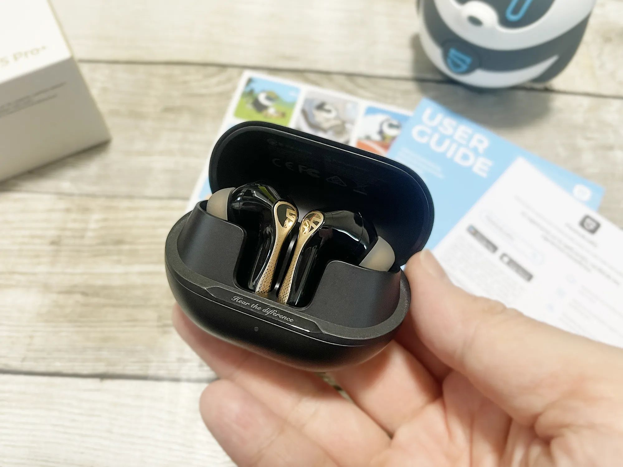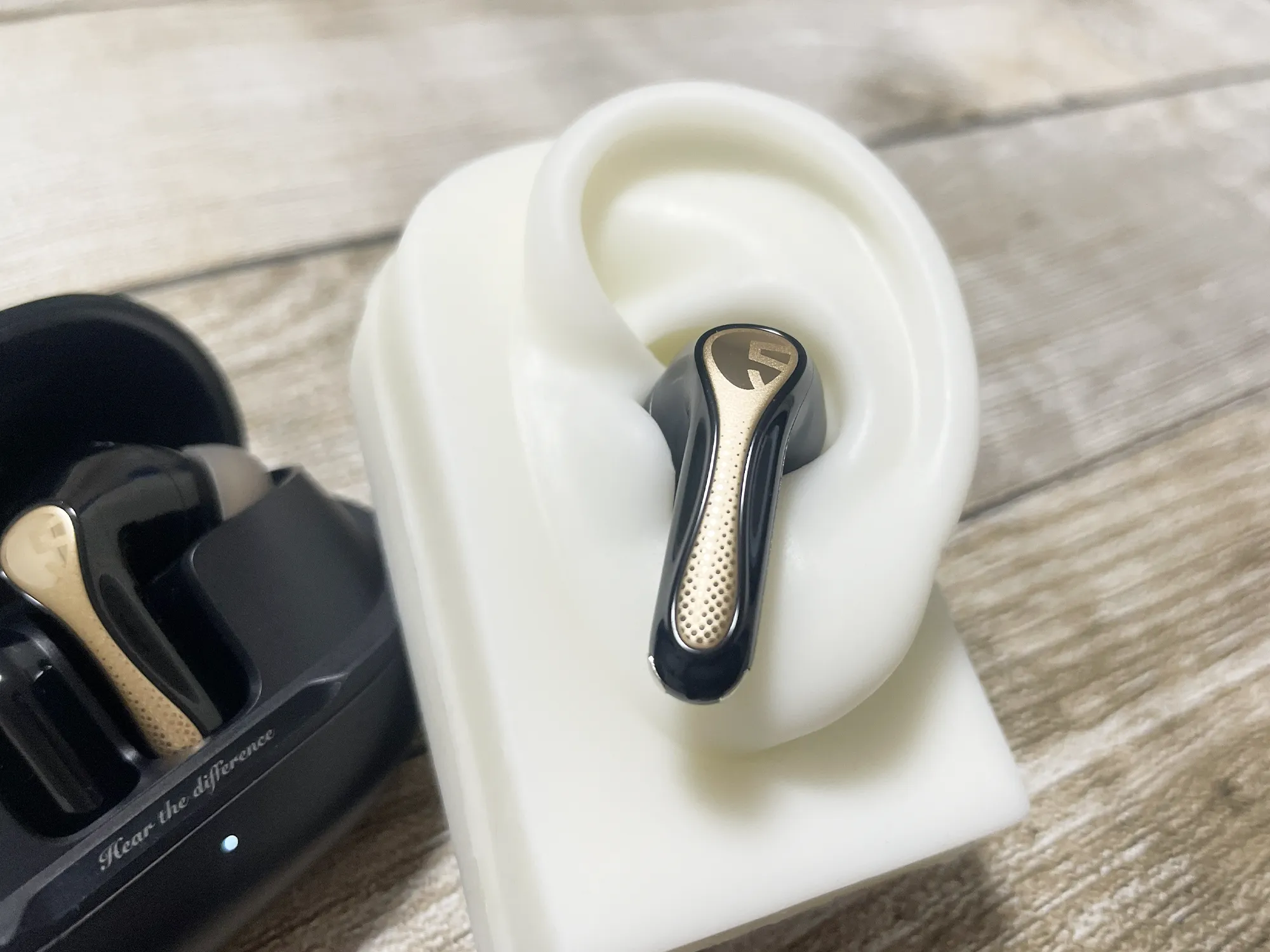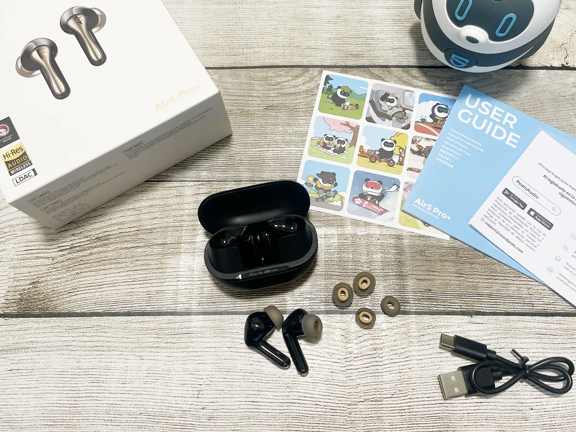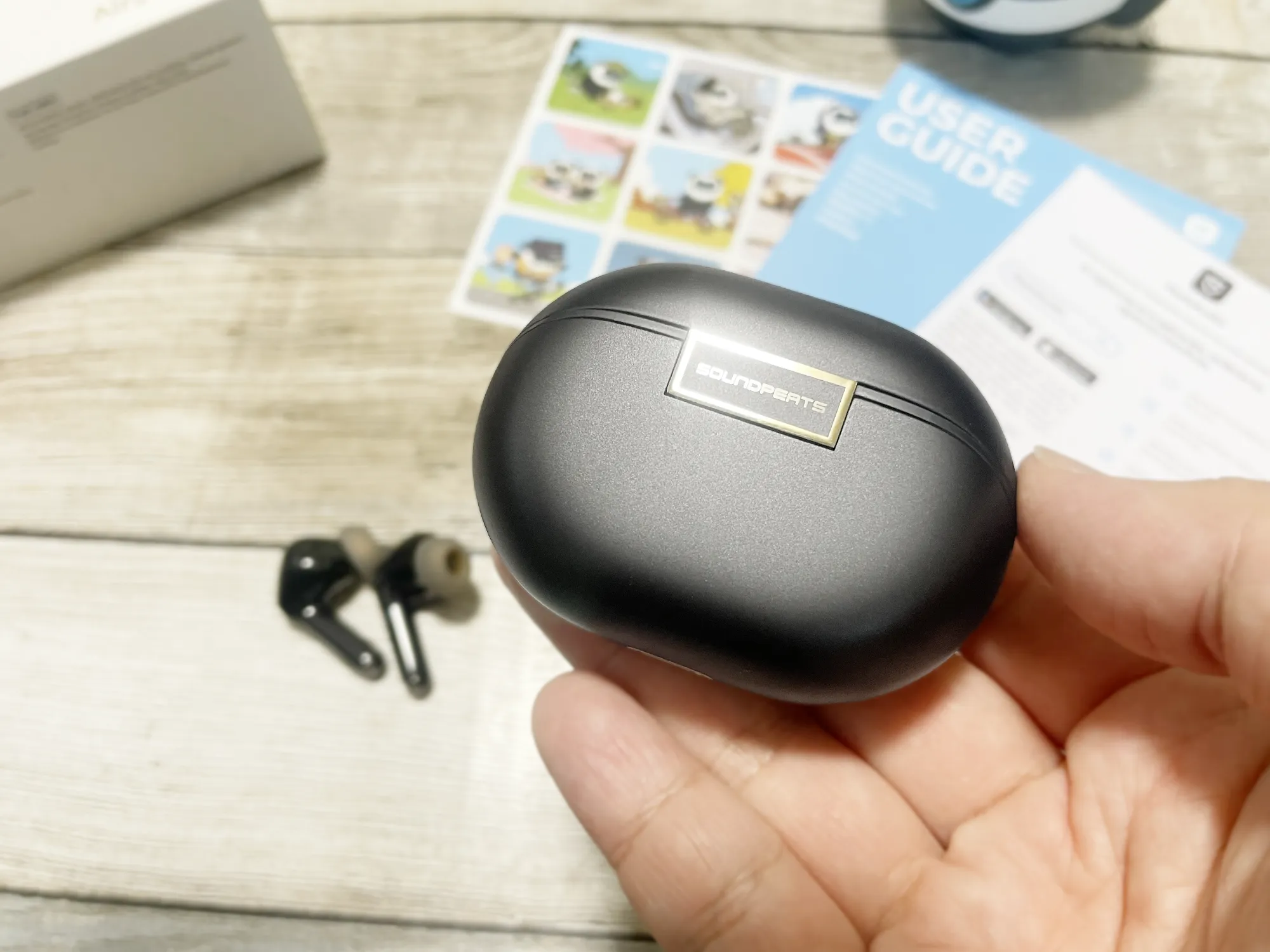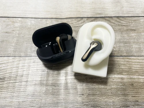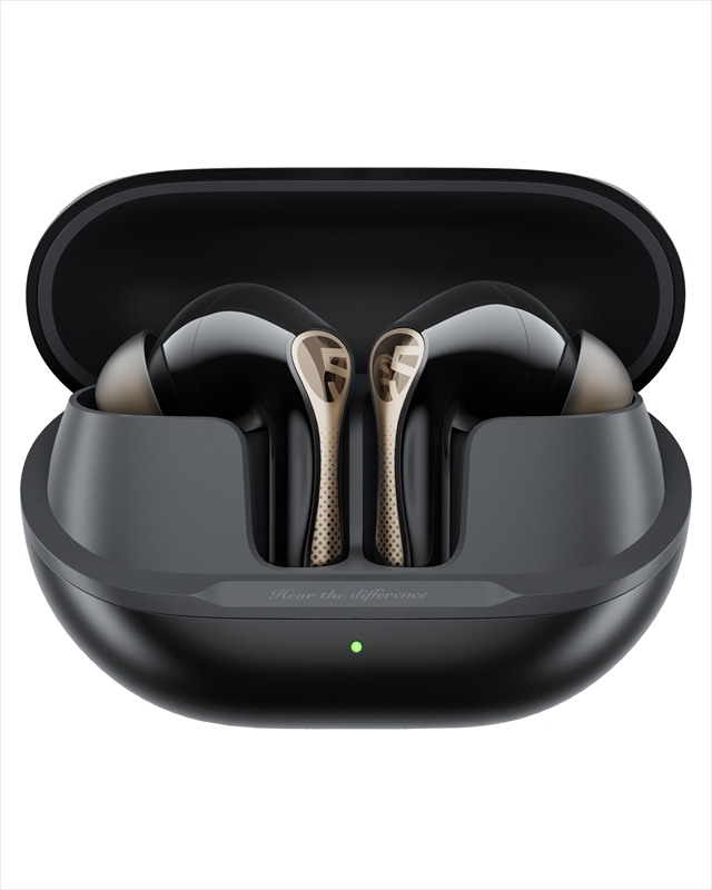 SOUNDPEATS『Air5 Pro Plus』実機レビュー 音質・外観・ANC性能◎ 高完成度・超コスパ ワイヤレスイヤホン【製品提供記事】 SOUNDPEATS『Air5 Pro Plus』実機レビュー 音質・外観・ANC性能◎ 高完成度・超コスパ ワイヤレスイヤホン【製品提供記事】 評価:4.5 黒野でみを 公開:2026年2月28日(8時間前) / 更新:2026年3月1日 コメント 0件 コラムハードウェアレビューBluetoothイヤホン・ヘッドホンガジェットクーポンレビュー製品情報製品提供記事 Post X Share Facebook B! はてブ LINE 当記事の内容および記事中のリンクには、広告目的や当サイトが収益を得るためのものが含まれており、これらの収益によってuzurea.netは運営されています。 SOUNDPEATS(サンドピーツ)より2025年3月21日発売のワイヤレスイヤホン『Air5 Pro Plus(Air5 Pro+)』をご提供いただきました。実際にしばらく使用した上での感想や特性を徹底的にレビューします。 簡単な総評として、サウンド面へのこだわりが随所に感じられ、さまざまな場面で高音質が楽しめるバランスのとれた良いプロダクトという印象です。 記事の索引1 SOUNDPEATS 『Air5 Pro+』ノイズキャンセル搭載 完全ワイヤレスイヤホン 実機レビュー1.1 参考 Air5 ProとAir5 Pro+のスペック比較1.2 パッケージ内容1.3 外観をチェック1.4 イヤホンの装着感1.5 ドライバー構成とコーデックについて1.6 音質レビュー1.7 操作感・操作法・アプリについて1.8 製品スペック2 まとめと、総合評価 SOUNDPEATS 『Air5 Pro+』ノイズキャンセル搭載 完全ワイヤレスイヤホン 実機レビュー SOUNDPEATS Air5 Pro+製品イメージ SOUNDPEATS Air5 Pro+製品イメージ2 『Air5 Pro+』は、2025年発売の『Air5 Pro』の後継モデルで、同社ラインナップの中でもハイクラスに位置づけられる最新機種です。 前モデルAir5 Proの幅広い対応コーデックを継承しつつ、サウンドドライバーをダイナミックドライバーとMEMSドライバーを組み合わせた複合構成とすることで、サウンド面のさらなる強化が図られています。通常価格は15,380円ですが、セール時には11,480円前後で推移しています。 詳しいレビューは後半に記載していますが、本製品の特徴を数点に絞ると…… マット仕上げのケース&ゴールドの金属部で高級感ある外観 心地よい低音で、空間を感じられる音質 -55dBのアクティブノイズキャンセル 装着感も◎、実売1万円台前半のイヤホンを探すなら有力候補 といった所で、文句なくお勧めできるアイテムだと感じました。 SOUNDPEATS(サウンドピーツ) Air5 Pro Plus ワイヤレスイヤホン ノイズキャンセリング MEMSドライバー ハイレゾ LDAC/aptX Adaptive Lossless Snapdragon Sound ハイブリッドドライバー マルチポイント/QCC3091/外音取り込みモード/低遅延/専用アプリ/防水 SoundPEATS(サウンドピーツ) ¥11,480 (2026/2/28 16:16:59時点 Amazon調べ-詳細) Amazonでのレビューを見る Amazonで検索 楽天市場で検索 Yahoo!ショッピングで検索 メルカリで検索 参考 Air5 ProとAir5 Pro+のスペック比較 詳細なレビューの前に、前機種Air5 Proとの性能比較をしておきましょう。外形サイズはAir5 Proと同型ですが、前述の通りドライバーがダイナミックドライバーとMEMSドライバーの複合構成となっている点が主な差異です。 また、MEMSドライバー搭載に伴う専用パワーアンプ駆動の影響で、イヤホン単体の再生時間はフル充電で連続6時間、充電ケース併用で合計30時間と、前モデルより若干短くなっています。 スペックAir5 ProAir5 Pro+ドライバーサイズ10mm10mm形状カナル型完全ワイヤレスイヤホンカナル型完全ワイヤレスイヤホンノイズキャンセリング対応(Adaptive ANC)対応(Adaptive ANC)対応コーデックaptX Lossless/aptx adaptive/aptx/AAC/SBC/LC3/LDACaptX Lossless/aptx adaptive/aptx/AAC/SBC/LC3/LDACサウンドドライバー10mm径ダイナミックドライバーMEMSドライバー「Cowell」+10mmダイナミックドライバー(デュアル銅線、PU +PEEK)サイズ(L×W×H)66.88×26.92×48.33mm(ケース込み)66.88×26.92×48.33mm(ケース込み)重量約4.8g(イヤホン/片側)約50.3g(充電ケース+イヤホン両側)約5g(イヤホン/片側)約51.11g(充電ケース+イヤホン両側)マルチポイント対応対応対応防水規格IPX5IPX5イヤホン(片耳)の再生可能時間7.5時間6時間充電ケースを含んだ再生時間37時間30時間ゲームモード対応対応特徴より軽量に、より高音質に最大55dBのノイズ低減より軽量に、より高音質に最大55dBのノイズ低減Amazon 販売ページAir5 ProAir5 Pro+ パッケージ内容 SOUNDPEATS Air5 Pro+のパッケージ内容※写真右上のピーツ君人形は製品に含まれません 製品パッケージの内容は以下の通りです。 Air5 Pro+ イヤホン本体(左右) 充電用ケース イヤーピース(サイズ3種 S/M/L) 充電用USBケーブル (Type-A→Type-C) 取扱説明書(多言語:日本語含む) アプリ説明書 ピーツくんのステッカー マニュアルは中国語と英語に加え、日本語、フランス語、イタリア語、スペイン語、ドイツ語、インドネシア語、韓国語と9か国語表記です。多言語対応は良いのですが、文字がかなり小さい点は気になりました。 外観をチェック Air5 Pro+※写真右上のピーツ君人形は製品に含まれません 本体の外観・サイズ