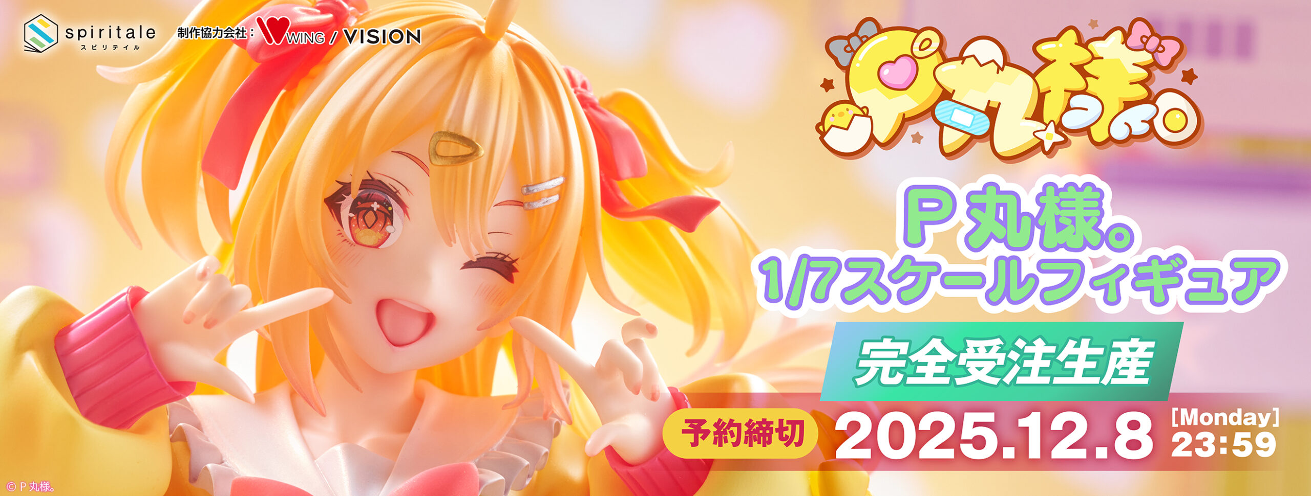 『P丸様。』フィギュアがスピリテイルより登場! 完全受注生産 12月8日予約締切 20,900円 UZUREA News 公開:2025年10月26日(5時間前) コメント 0件 趣味・文化VTuberYouTuberキャラクターフィギュア製品情報 Post X Share Facebook B! はてブ LINE 当記事の内容および記事中のリンクには、広告目的や当サイトが収益を得るためのものが含まれており、これらの収益によってuzurea.netは運営されています。 タイトーの高品質フィギュアブランド『spiritale(スピリテイル)』より、大人気マルチエンターテイナー『P丸様。』1/7スケールフィギュアが発売されます。完全受注生産で、価格は20,900円(税込)。予約受付締切は2025年12月8日(月)までとなっています。 記事の索引1 スピリテイル『P丸様。』1/7スケールフィギュア1.1 ギャラリー1.2 製品仕様 詳細2 関連リンク スピリテイル『P丸様。』1/7スケールフィギュア スピリテイル『P丸様。』1/7スケールフィギュア タイトーの高品質フィギュアブランド『spiritale(スピリテイル)』より、YouTubeやTikTokなどで活躍中の大人気マルチエンターテイナー『P丸様。』が初のフィギュア化! オレンジがかった髪色や大きなリボン、ふんわりと広がるスカートなど、衣装原案しぐれうい氏・イラスト作画久保田正輝氏による元気いっぱいな姿が忠実に再現されています。 フードにひよこの頭、背中には羽がついたひよこ風パーカーを身につけ、スカートにはオーロラ風のグラデーション塗装を施し、衣装の素材感を丁寧に表現。また、P丸様。のトレードマークである目玉焼き型の台座に加え、マスコットの『ぴよ丸』も立体化。その愛らしさにも是非ご注目ください。 ひよこ風パーカー&目玉焼き型の台座 本フィギュアは、タイトーの公式ショップ『TAITO GEAR&GOODS』限定で2026年7月発売予定。予約受付2025年12月8日(月)までの完全受注生産となり、販売価格は20,900円(税込)です。 P丸様。 1/7スケールフィギュア予約&詳細ページ 毎回クオリティが高いspiritaleですが、今回のP丸様。も細部までこだわりが詰まった造形に仕上がっています🐣🍳 【MV】ぜんりょくじょしかくめい!/P丸様。 【MV】ぜんりょくじょしかくめい!/P丸様。 ギャラリー P丸様。らしいはじけるエネルギーを表現。片足を軽やかに上げた動きのある姿が、今にも動き出しそうな躍動感を演出。明るく元気なウィンクと満面の笑顔で、P丸様。らしいポジティブな魅力を最大限に表現。生き生きとした表情がフィギュア全体の雰囲気をさらに引き立てます。 製品仕様 詳細 予約受付2025年12月8日(月)までの完全受注生産 画像はTAITO GEAR&GOODS公式サイトより 商品名 P丸様。 1/7スケールフィギュア 価格 20,900円(税込) 予約期間 2025年10月24日(金)11:00 ~ 2025年12月8日(月)23:59まで 発送予定 2026年7月 素材 PVC、ABS サイズ 高さ:約240mm (台座含む)横:約130mm奥行き:約100mm 対象年齢 15歳以上 権利表記 © P丸様。 原型制作 カブ 彩色 鳴海 撮影 VaistarStudio ディレクション VISION 制作協力会社 WING 本商品は完全受注生産商品となります。 1注文につき1個までの販売となります。 配送料は、商品1個につき全国一律770円(税込)です。 P丸様。 1/7スケールフィギュア予約&詳細ページ 本日10月24日からハイクオリティフィギュア予約開始〜💛💛みなさんほんっっとお待たせしました〜🐣✨P丸様。1/7スケールフィギュア販売でーーーーすッッ✨12月8日まで完全受注生産です〜💛 ✨ お迎えしてくれる子だれだ〜🐣🎀https://t.co/LA83oD2EFD#PR #P丸様#スピリテイル #spiritale https://t.co/cjLOIp482Q pic.twitter.com/p3smbooMZm— P丸様。🐣🍳 (@p_ma_ru) October 24, 2025 関連リンク スピリテイル公式Webサイト spiritale(スピリテイル)公式(@Spiritale_shop) / X P丸様。 公式サイト P丸様。 – YouTubeチャンネル P丸様。🐣🍳(@p_ma_ru) / X とあるvtuberの中の人だった時のお話・・・。【P丸様。】 とあるvtuberの中の人だった時のお話・・・。【P丸様。】 P丸様。と中学英単語1000語がマスターできるわけな…できまーーーすっ!! ¥1,650 (2025/10/26 22:05:00時点 Amazon調べ-詳細) Amazonでのレビューを見る Amazonで検索 楽天市場で検索 Yahoo!ショッピングで検索 メルカリで検索 【Amazon.co.jp限定】P丸様。1st Live “Peace Parade!!” (特典:ビジュアルシート付)[Blu-Ray] STPR Records Amazonでのレビューを見る Amazonで検索 楽天市場で検索 Yahoo!ショッピングで検索 メルカリで検索
