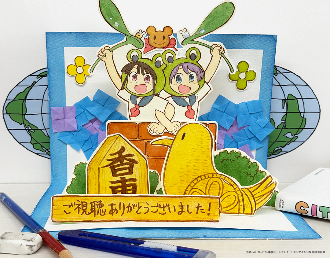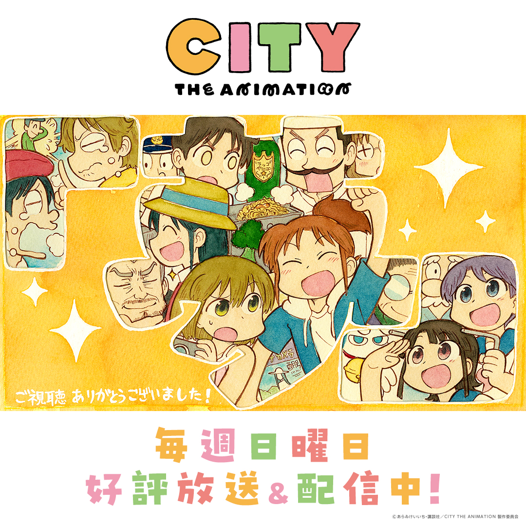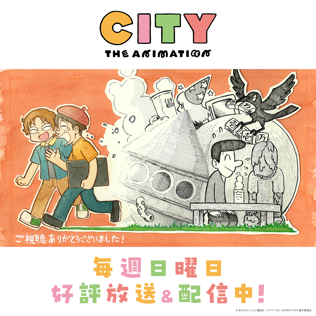 画像 動画 スタッフ 原作:あらゐけいいち『CITY』(講談社「モーニング」所載) 監督:石立太一 キャラクターデザイン・総作画監督:徳山珠美 美術監督:山崎詩央里 色彩設計:宮田佳奈 撮影監督:植田弘貴 3D監督:加瀬達規 音響監督:鶴岡陽太 音楽:ピラニアンズ 音楽制作:ポニーキャニオン オープニング主題歌:Furui Riho「Hello」 エンディング主題歌:TOMOO「LUCKY」 アニメーション制作:京都アニメーション 製作:CITY THE ANIMATION 製作委員会 キャスト 南雲美鳥:小松未可子 にーくら:豊崎愛生 泉 わこ:石川由依 真壁鶴菱:川原慶久 真壁立涌:入野自由 真壁まつり:七瀬彩夏 雨飾えり:田所あずさ 泉 りこ:和久井 優 安達太良博士&安達太良の父:子安武人 安達太良の母:浅野まゆみ 安達太良達太:KENN 安達太良良太:猪股慧士 安達太良かもめ:林 鼓子 安達太良うみ:福嶋晴菜 安達太良そら:天麻ゆうき 鬼カマボコ/漫画家:宮崎遊 轟/『週刊CITY誌』編集部:鈴木崚汰 ナベ菫桜子美:後藤邑子 穂高:土門仁 帯那林道:金子誠 黒金大和:髙坂篤志 光岳伸晃:福山潤 ナレーション:大塚芳忠 主題歌・挿入歌オープニング主題歌「Hello」 Furui RihoAmazonで検索エンディング主題歌「LUCKY」TOMOOAmazonで検索