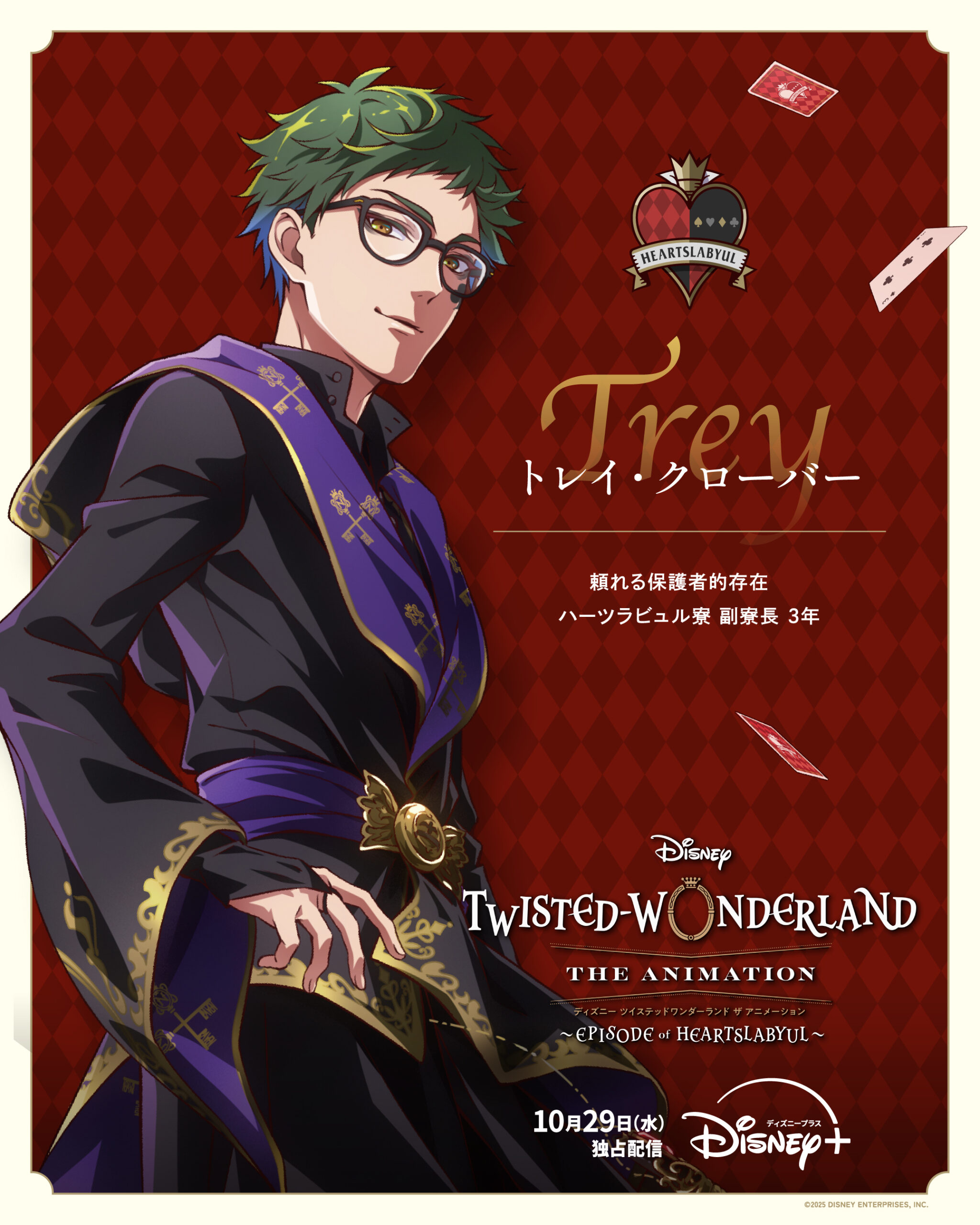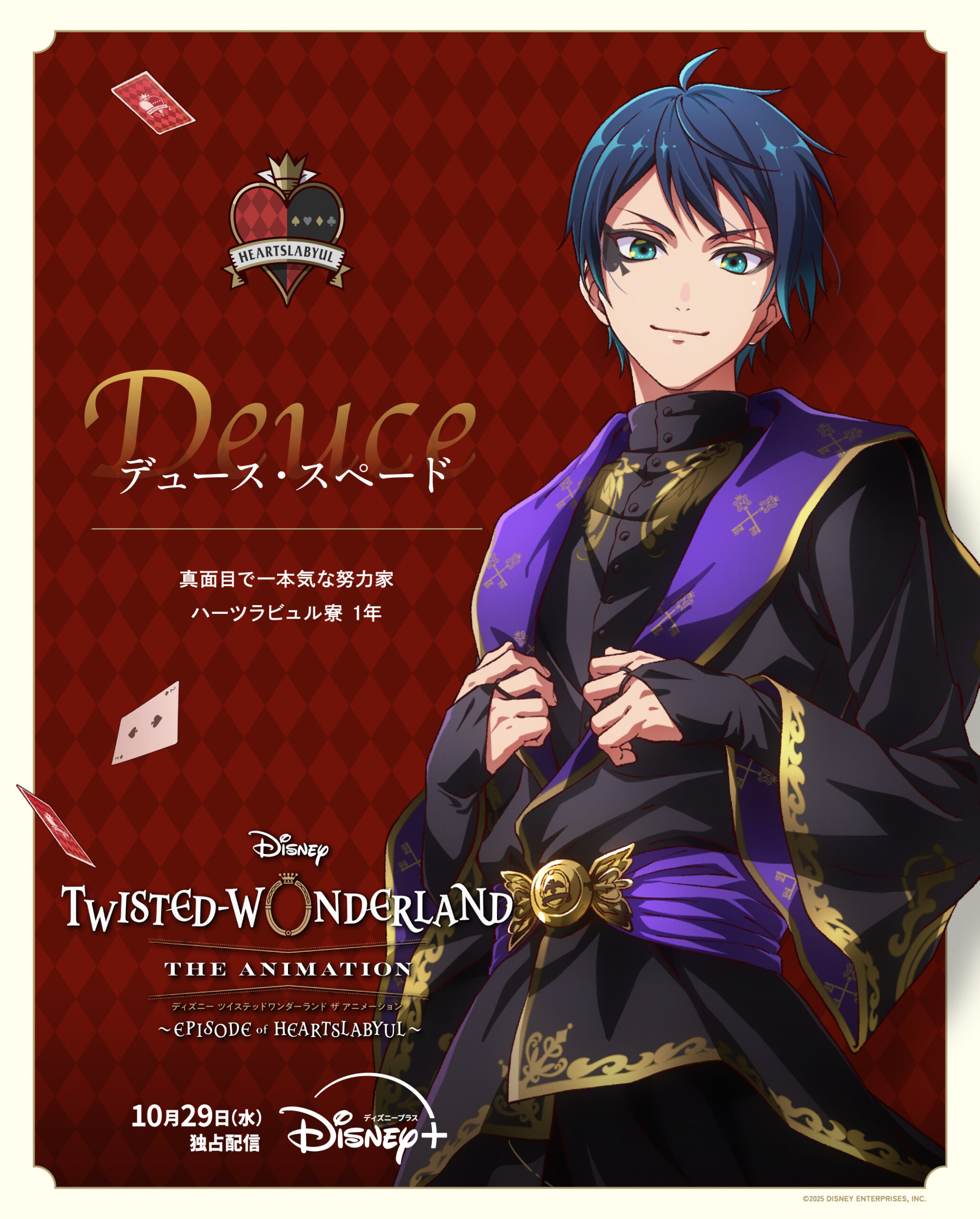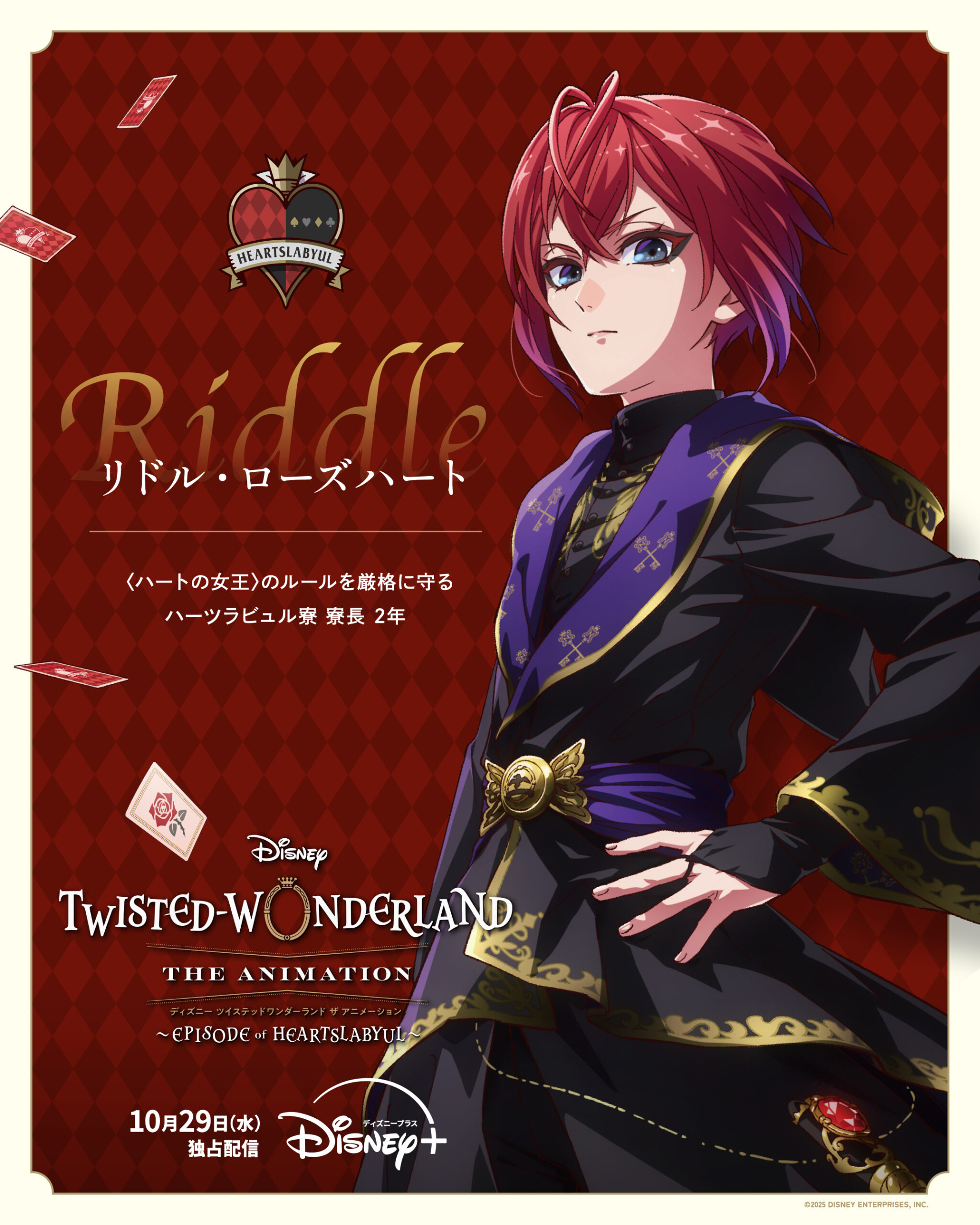 ストーリーツイステッドワンダーランド、そこは魔法が存在する世界。その世界にかつて実在し、“伝説”として語り継がれる偉大なる存在が「グレート・セブン>」ハートの女王、百獣の王、海の魔女、砂漠の魔術師、美しき女王、死者の国の王、茨の魔女、7つの“伝説”は今もなお息づいている。そんなツイステッドワンダーランドにおいて、「グレート・セブン」に倣った7つの寮を擁する名門魔法士養成学校が「ナイトレイブンカレッジ」である。 各寮を束ねる7寮長の一人がハートの女王の厳格な精神に基づくハーツラビュル寮の寮長・リドル・ローズハート。“真紅の暴君”と称されるリドルは、寮生たちを“ハートの女王の法律”によって厳格に支配し苦しめている。そんな中、入学式を迎えたある日、現実世界に暮らす男子高校生・円満雄剣がツイステッドワンダーランドに迷い込んでしまう。果たして、雄剣は元の世界に戻ることができるのか。 画像 動画 スタッフ 総監督・シリーズ構成:名取孝浩 監督:片貝慎 メインライター:加藤陽一 キャラクターデザイン:中野花香・佐藤茜 サブキャラクターデザイン:つなきあき 色彩設計:安部なぎさ 美術監督:松本浩樹 3DCGディレクター:大矢和也 撮影監督:サイトウタカオ 編集:瀧川三智 音響監督:菅原三穂 音楽:尾澤拓実 音楽制作:アニプレックス オープニングテーマ:Night Ravens「Piece of my world」 アニメーション制作:ゆめ太カンパニー×グラフィニカ キャスト リドル・ローズハート:花江 夏樹 エース・トラッポラ:山下 誠一郎 デュース・スペード:小林 千晃 トレイ・クローバー:鈴木崚汰 ケイト・ダイヤモンド:小林竜之 ディア・クロウリー:宮本 充 グリム:杉山 紀彰 円満雄剣:阿座上洋平 レオナ・キングスカラー:梅原 裕一郎 ジャック・ハウル:坂 泰斗 ラギー・ブッチ:市川 蒼 アズール・アーシェングロット:田丸 篤志 ジェイド・リーチ:駒田 航 フロイド・リーチ:岡本 信彦 カリム・アルアジーム:古田 一紀 ジャミル・バイパー:二葉 要 ヴィル・シェーンハイト:相葉 裕樹 エペル・フェルミエ:土屋 神葉 ルーク・ハント:糸川 耀士郎 イデア・シュラウド:内山 昂輝 オルト・シュラウド:蒼井 翔太 マレウス・ドラコニア:加藤 和樹 リリア・ヴァンルージュ:緑川 光 シルバー:島﨑 信長 セベク・ジグボルト:石谷 春貴 デイヴィス・クルーウェル:伊東 健人 モーゼズ・トレイン:小山 力也 アシュトン・バルガス:竹内 良太 サム:木村 昴 闇の鏡:堀内 賢雄 チェーニャ:濱 健人 主題歌・挿入歌オープニングテーマで「Piece of my world」Night RavensAmazonで検索エンディングテーマ「Obedience」ハーツラビュル寮生Amazonで検索