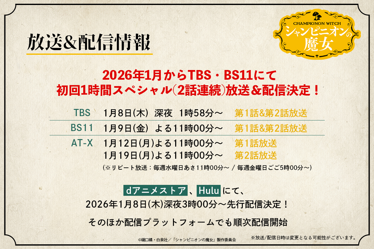 • TBS深夜1時58分〜、ほかBS11、AT-Xにて 初回2話放送/配信dアニメストア、Huluにて先行配信 1月8日(木)深夜3時00分~