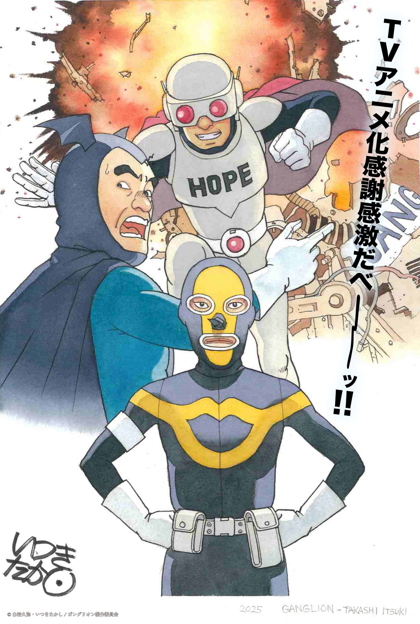 ストーリー2000年代初頭の東京。世界征服を目論む「株式会社ガングリオン」の戦闘員・磯辺。彼の職場は戦場だ。タイツ一枚で「東京スギ花粉作戦」や「富士山爆破作戦」に臨むも、ヒーロー・ホープマンの正義という名の一撃にあっさり惨敗。コンプラ黎明期、上司の無茶にもひたすら耐えて奮闘する…すべてのはたらく人々に捧ぐ、“お仕事”ドラマ。どこか人ごとではない、哀しきサラリーマン戦闘員の物語。 画像 動画 スタッフ 原作:白岩久弥 漫画:いつきたかし(ヨシモトブックス) 企画:吉本興業 脚本:はりせ 監督:渡辺歩 助監督:田中亮輔 キャラクターデザイン・総作画監督:藤田しげる コンテ:田中亮輔、宮本託自、宮地昌幸、山本寛、山村日向、牛嶋新一郎、ソガメグミ、安部祐二郎 シリーズ構成:塩野智章 色彩設計:中野尚美 美術監督:中村嘉博 撮影監督:横山友哉 動画監督:新井田風香 CGディレクター:向井択海 編集:廣瀬清志 音楽:浅見武男 音楽制作:INSPION 音響監督:小泉紀介 音響制作:INSPIONエッジ アニメーション:深江暢 アニメーション制作:studio maf 協力:よしもとブロードエンタテインメント 製作:ガングリオン製作委員会 キャスト 磯辺健司:上田燿司 シャドー大佐(本名影山稔):立木文彦 ホープマン(HOPEMAN):杉田智和 磯辺節子:古賀葵 磯辺タカシ:青山吉能 ユミコ:遠野ひかる 屋台のオヤジ:板尾創路 主題歌・挿入歌エンディング主題歌「ミラクル」NIKO NIKO TAN TANAmazonで検索