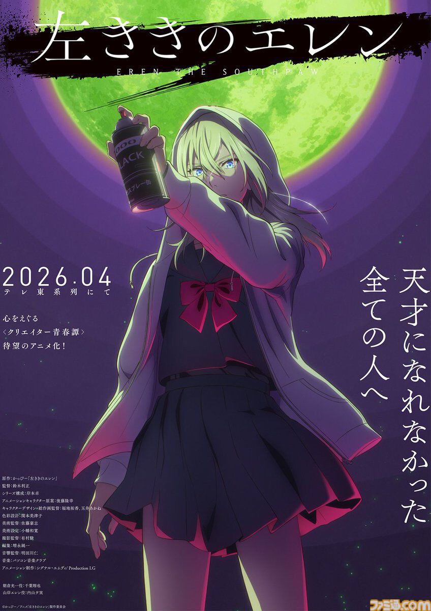 ストーリー高校生活も半分が過ぎ、誰もが本格的に進路を考えはじめる頃。デザイナーになるため美大を目指す朝倉光一は、ある日、美術館の壁に殴り描きされたグラフィティに衝撃を受ける。描いたのは、ある出来事をきっかけに才能を封じ込めてきた、左ききの女子高生・山岸エレンだった。 画像 動画 スタッフ 原作:かっぴー「左ききのエレン」 監督:鈴木利正 シリーズ構成:岸本卓 アニメーションキャラクター原案:後藤隆幸 キャラクターデザイン・総作画監督:福地祐香、玉井あかね 色彩設計:関本美津子 美術監督:佐藤豪志 美術設定:小幡和寛 撮影監督:有村駿 編集:増永純一 音響監督:明田川仁 音楽:パソコン音楽クラブ アニメーション制作:シグナル・エムディ、Production I.G 製作:アニメ「左ききのエレン」製作委員会 キャスト 朝倉光一:千葉翔也 山岸エレン:内山夕実
