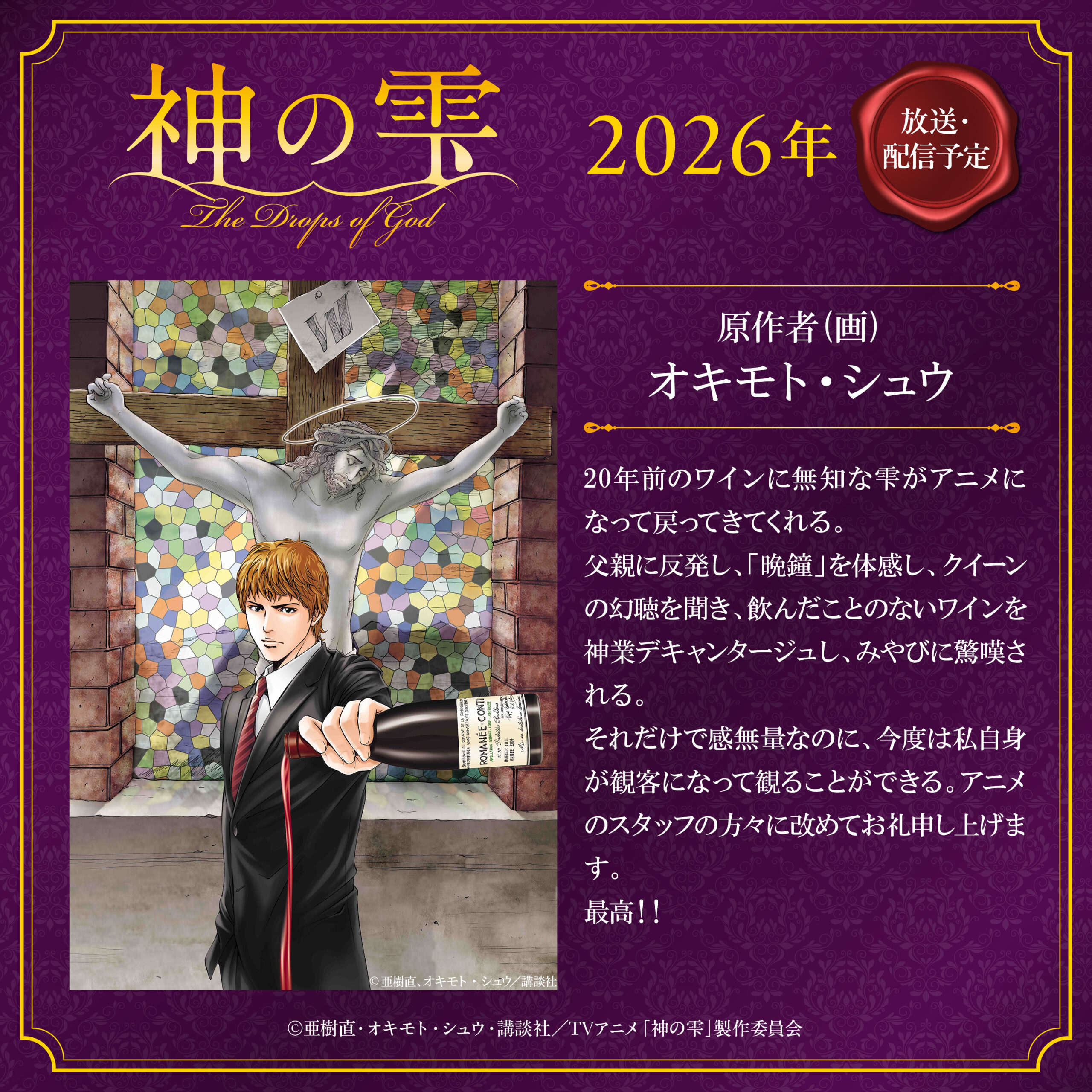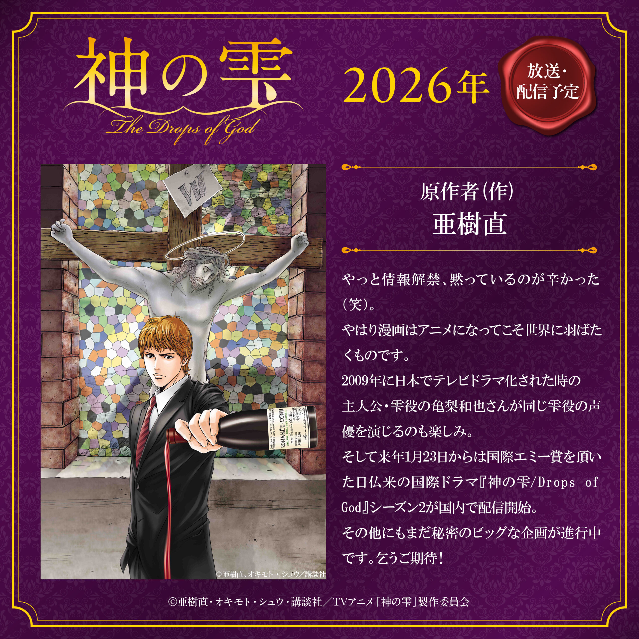 ストーリーUncork the moment. 世界的ワイン評論家・神咲豊多香がこの世を去り、時価120億円を超えるワインコレクションが遺された。その遺言状には、彼が選んだ偉大なる12本のワイン“十二使徒”とその頂点に立つ幻の1本“神の雫” を、銘柄および生産年まで言い当てた者に遺産のすべてを譲り渡すと記されていた。この壮大な挑戦に挑むのは、豊多香の実の息子でワインの英才教育を受けながらも父に背き、ワインを口にした経験のない神咲雫と、豊多香と養子縁組を結んだ若きカリスマワイン評論家・遠峰一青の2人。 ワインとは、親子とは、人生とはなにか。幻のワイン“神の雫”を巡り繰る複雑で芳醇な戦いが、今、始まる―― 画像 動画 スタッフ 原作:亜樹直、オキモト・シュウ 監督:糸曽賢志 シリーズ構成・脚本:三津留ゆう キャラクターデザイン:諏訪壮大 美術設定:古宮陽子 色彩設計:内林裕美 3DCGディレクター:後藤浩幸 撮影監督:川田哲矢 編集:兼重涼子 音響監督:横田知加子 音響制作:Studio Sound Bee 音楽:瀬川英史 音楽制作:ポニーキャニオン アニメーション制作:サテライト アニメーション制作協力:YANCHESTER 製作:TVアニメ「神の雫」製作委員会 キャスト 神咲雫:亀梨和也 遠峰一青:佐藤拓也 紫野原みやび:内田真礼 神咲豊多香:銀河万丈