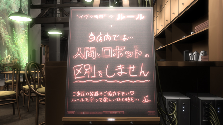 高校生のリクオも幼少の頃からの教育によってアンドロイドを人間視することなく、便利な道具として利用していた。ある時、リクオは自家用アンドロイドのサミィの行動記録に「** Are you enjoying the time of EVE? **」という不審な文字列が含まれている事に気付く。行動記録を頼りに親友のマサキとともにたどり着いた先は、「当店内では、人間とロボットの区別をしません」というルールを掲げる喫茶店「イヴの時間」だった。