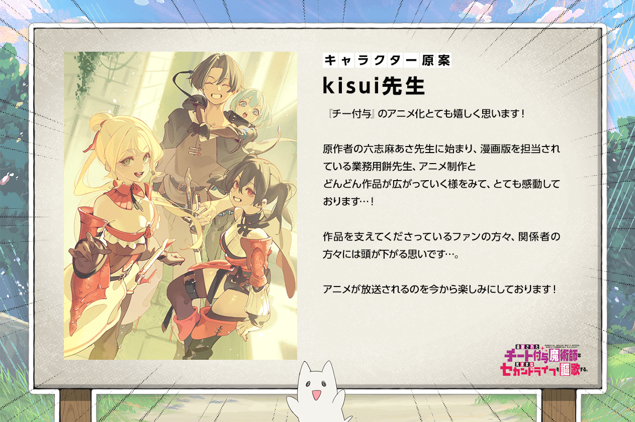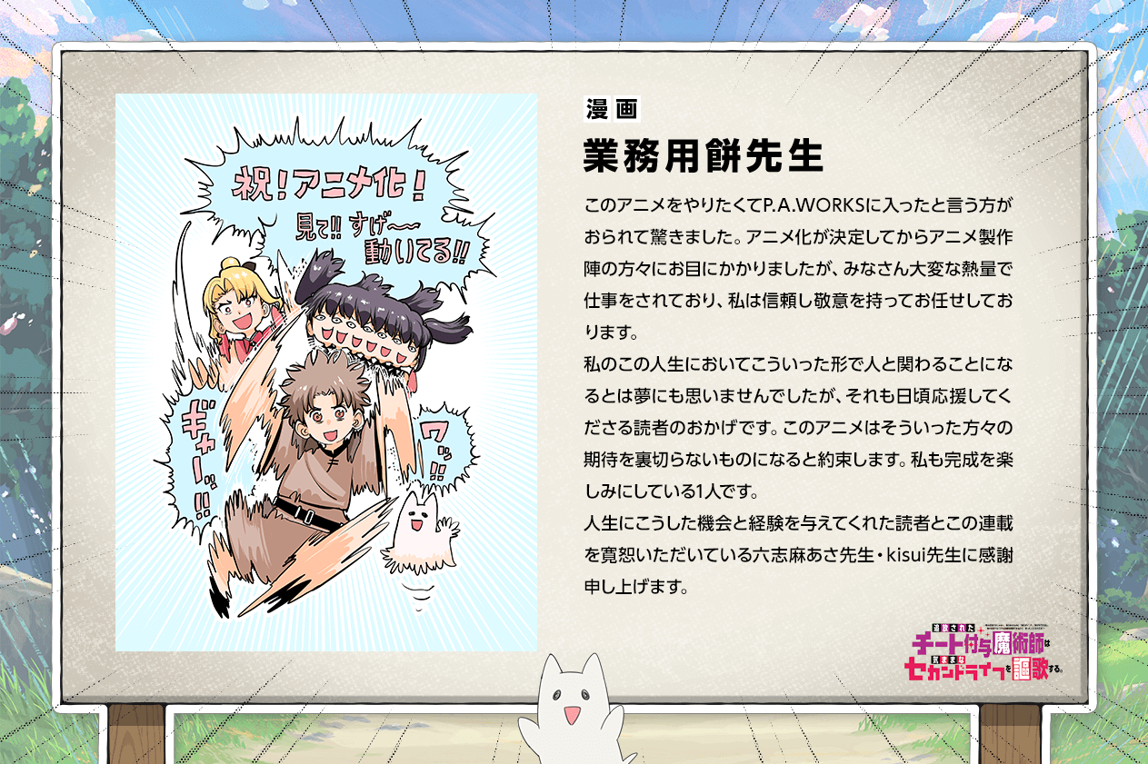 累計発行部数が130万部を突破し(※電子書籍含む)、新エピソード配信の度にSNSを騒がせる、講談社「月マガ基地」にて連載中のファンタジー漫画「追放されたチート付与魔術師は気ままなセカンドライフを謳歌する。」がついにアニメ化!! アニメーション制作はこれまで数々の良質なオリジナルアニメを手がけてきたP.A.WORKSが担当!!