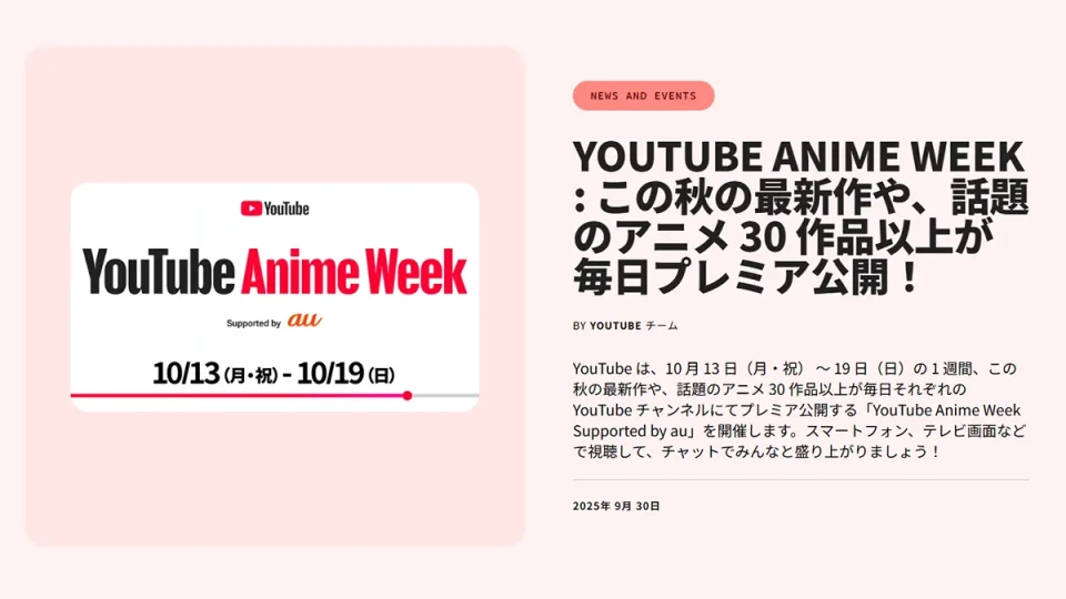 『YouTube Anime Week』10月19日まで開催 人気アニメ30作品以上が日替わりで無料視聴可能 『名探偵コナン』『ヒロアカ』など UZUREA News 公開:2025年10月13日(7時間前) コメント 0件 漫画・アニメYouTubeアニメイベント動画配信 Post X Share Facebook B! はてブ LINE 当記事の内容および記事中のリンクには、広告目的や当サイトが収益を得るためのものが含まれており、これらの収益によってuzurea.netは運営されています。 YouTubeは、2025年10月13日(月・祝)から19日(日)までの1週間、『YouTube Anime Week Supported by au』を開催。本イベントでは、『名探偵コナン』『僕のヒーローアカデミア FINAL SEASON』『キングダム』など、注目のアニメ30作品以上が毎日プレミア公開されます。 各作品はそれぞれの公式チャンネルや、YouTube Japan公式チャンネル内の特設再生リストで視聴可能。チャット機能を通じてリアルタイムで盛り上がりましょう! 記事の索引1 『YouTube Anime Week』10月13日から1週間開催 アニメ30作品以上が日替わり公開1.1 チャット機能で全国のファンと一緒に盛り上がろう1.2 公開予定アニメ作品2 関連リンク 『YouTube Anime Week』10月13日から1週間開催 アニメ30作品以上が日替わり公開 最新作から名作まで、幅広いラインナップで楽しめるアニメ配信イベント『YouTube Anime Week Supported by au』が開催です。 『YouTube Anime Week』10月13日から1週間開催 画像は公式動画より イベント期間は、10月13日(月・祝)から19日(日)までの7日間。毎日さまざまなアニメ作品がプレミア公開されます。注目は、来年でアニメ30周年を迎える『名探偵コナン』をはじめ、シリーズ最終章となる『僕のヒーローアカデミア FINAL SEASON』、新シリーズ開幕の『キングダム』など、豪華すぎる顔ぶれです。 さらに、登録者数100万人を超える『クレヨンしんちゃん』や、そのスピンオフ作品『野原ひろし 昼メシの流儀』など、家族で楽しめる作品も勢ぞろい。各作品はそれぞれのYouTube公式チャンネルで公開されるほか、YouTube Japan公式チャンネルの『YouTube Anime Week』再生リストでもまとめて視聴できます。 YouTube Anime Week : この秋の最新作や、話題のアニメ 30 作品以上が毎日プレミア公開! – YouTube Blog YouTube Anime Week特設リスト YouTube Anime Week Supported by au YouTube Anime Week Supported by au チャット機能で全国のファンと一緒に盛り上がろう プレミア公開中は、チャット機能を使って他の視聴者とリアルタイムで交流することができます。SNSではなく、同じ画面を見ながら一斉にコメントし合えるのがYouTubeならではの楽しみ方です。好きなシーンで盛り上がるもよし、感想を語り合うもよし。アニメ好き同士の一体感を味わえる時間になりそうです。 公開予定アニメ作品 YouTube Anime Week 公式タイムテーブル 画像はYouTube Blogより 作品の公開スケジュールは公式タイムテーブルで順次公開予定。見逃したくない作品がある場合は、各チャンネルでリマインダー設定をしておくと便利です。また、特設の再生リストにも、公開に合わせてリンクが追加されていきます。 ※以下作品名に付いているリンク先は作品が公開される予定のYouTubeチャンネルです。※掲載は五十音順です。公開順ではないのでご注意ください。 アイカツ! 暗殺者である俺のステータスが勇者よりも明らかに強いのだが 怪獣8号 ガチアクタ ガンダムシリーズ 周年コレクション 銀河特急 ミルキー☆サブウェイ キングダム 銀魂 クレヨンしんちゃん 劇場版 異世界かるてっと ~あなざーわーるど~ 劇場版 遊☆戯☆王 〜超融合!時空を越えた絆〜 ケロロ軍曹 コードギアス 反逆のルルーシュ コードギアス 反逆のルルーシュ ナナリーinワンダーランド コードギアス 亡国のアキト SANDA SI-VIS: The Sound of Heroes ジョジョの奇妙な冒険 SPY×FAMILY ゾンビランドサガ DIGIMON BEATBREAK 永久のユウグレ とんでもスキルで異世界放浪メシ 野原ひろし 昼メシの流儀 ブルーロック 僕のヒーローアカデミア 味方が弱すぎて補助魔法に徹していた宮廷魔法師、追放されて最強を目指す 名探偵コナン ワンパンマン YouTube Anime Week特設リスト 配信される2025年秋アニメ作品 作品情報 暗殺者である俺のステータスが勇者よりも明らかに強いのだが 作品情報 アニメシリーズ 公開日: –原作者: 赤井まつり監督: 羽原信義プロデューサー: –脚本: 岡田邦彦シリーズ構成: 岡田邦彦制作会社: サンライズ作品概要: シリーズ累計(紙・電子)発行部数150 万部超え(2025 年2 月時点)の赤井まつり原作。 クラスメイトと共に異世界に召喚された高校生・織田 晶。召喚によってクラスメイト全員にチート能力が付与される中、彼は生来の影の薄さからか平凡な“暗殺者”の能力を得る。だが、ただの“暗殺者”のはずなのにステータス値が、最強の職業“勇者”すら軽々と凌駕していて――!? 冤罪をかけられて逃げ込んだ迷宮深層で、エルフの美少女アメリアと出会い――。これは“暗殺者”の能力を得た少年が、エルフの少女と出逢い真の”暗殺者”へと至るまでの物語。公式Webサイト: https://sutetsuyo-anime.com公式S